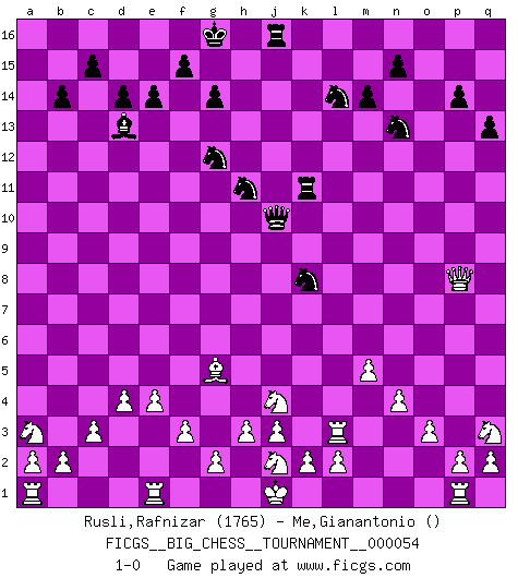 Last move : 1-0 2010 May 30 10:31:26 [Event "FICGS__BIG_CHESS__TOURNAMENT__000054"] [Site "FICGS"] [Date "2009.11.20"] [Round "1"] [White "Rusli,Rafnizar"] [Black "Me,Gianantonio"] [Result "1-0"] [WhiteElo "1765"] [BlackElo ""] 1.j2-k4 p15-p14 2.h1-o7 g16-f14 3.o7-o15 p16-o14 4.o15-c4 b16-c14 5.m2-m4 o16-p15 6.d2-d4 b15-b14 7.e2-e4 c16-b15 8.n2-n4 k16-l14 9.m4-m5 e15-e14 10.o1-d11 g15-g14 11.l1-o4 d15-d14 12.d11-b13 c14-e13 13.b13-e16 f14-e16 14.p1-q3 f16-g15 15.b1-a3 a16-c16 16.c2-c3 m15-m14 17.c1-n11 k15-k14 18.f1-e2 l16-k15 19.k1-l3 l14-n13 20.g1-j2 g15-f14 21.e2-n10 e16-g15 22.c4-f7 g15-f13 23.f7-g6 k15-n12 24.g6-a6 o14-p12 25.n11-p13 m16-n16 26.a6-a15 b15-d13 27.n10-j14 h15-g13 28.j14-d9 q15-q14 29.p13-l9 g13-e12 30.l9-k8 f13-e11 31.d9-e8 h16-d16 32.a15-a11 e13-c12 33.a11-f6 n16-p16 34.f6-l11 c12-d10 35.e8-f7 n13-l14 36.l11-e11 p16-o16 37.e11-h14 f14-g13 38.h14-g15 d16-e15 39.k8-j9 q16-p16 40.f7-p16 o16-p16 41.k4-l6 p15-j9 42.o4-j9 n12-g6 43.h2-j4 j15-h13 44.g15-l15 h13-k12 45.l15-k14 g13-h12 46.k14-p9 p12-n13 47.j9-l11 e15-f14 48.f2-f3 c16-h16 49.p9-g9 g6-j4 50.l3-j4 h12-j11 51.g9-j9 h16-h14 52.l6-j7 h14-j14 53.j9-d9 f14-f10 54.j7-h9 f10-j10 55.h9-j11 j14-j11 56.l11-g7 d10-c12 57.m1-m3 e12-f10 58.d9-n9 f10-h11 59.m3-l3 j10-p4 60.q1-p1 c12-e13 61.g7-f8 j11-k11 62.n9-o8 p16-k16 63.f8-d10 k16-l16 64.o8-o9 j16-h16 65.o9-k13 l16-j16 66.k13-k14 h16-g16 67.d10-h14 e13-g12 68.k14-k13 g16-h16 69.k13-k14 h16-g16 70.o2-o3 p4-j10 71.h14-c9 k12-l10 72.k14-p9 l10-k8 73.c9-g5 q14-q13 74.p9-p8 1-0 Follow this game move after move (download)Of all my Russian books, the defense contains and diffuses the greatest 'warmth' which may seem odd seeing how supremely abstract Chess is supposed to be. (Vladimir Nabokov) Nur ein wirklich starker Spieler weiß wie schwach er spielt. (Savielly Grigorievitsch Tartakower) Es el objetivo de la escuela moderna no tratar cada posición de acuerdo a una regla general, sino de acuerdo al principio inherente en la posición. (Richard Reti) Les Echecs mettent en conflit, non pas deux intelligences, mais deux volontés. (Lasker) Vladimir Ras-Putin is still alive... He is also a good actor, I saw him in the Lord of the Rings. (Rodolfo d'Ettorre)