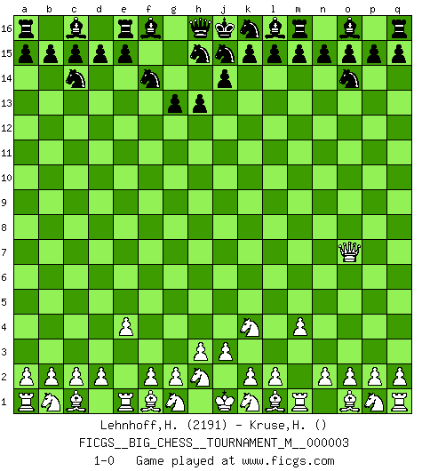 Last move : 1-0 2009 November 28 14:26:30 [Event "FICGS__BIG_CHESS__TOURNAMENT_M__000003"] [Site "FICGS"] [Date "2009.11.21"] [Round "1"] [White "Lehnhoff,Heinz-Georg"] [Black "Kruse,Herbert"] [Result "1-0"] [WhiteElo "2191"] [BlackElo ""] 1.j2-k4 g15-g13 2.e2-e4 b16-c14 3.h1-o7 p16-o14 4.o7-f15 g16-f14 5.f15-o7 h14-h13 6.m2-m4 1-0 Follow this game move after move (download)What is the object of playing a gambit opening?... To acquire a reputation of being a dashing player at the cost of losing a game. (Siegbert Tarrasch) Die Arbeit ist etwas Unnatürliches. Die Faulheit allein ist göttlich. (Anatole France) El Ajedrez es parte de una cultura y si una cultura esta en decadencia, entonces también el Ajedrez declinará. (Mikhail Botvinnik) La tactique est l'élément le plus important du milieu de jeu. (Siegbert Tarrasch) Locking firmely the window serves nothing, only small thiefs pass through there, the big thiefs enter through the front door. (Luc-Olivier Leclerc)