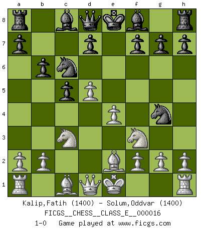 Last move : 1-0 2006 December 21 19:39:28 [Event "FICGS__CHESS__CLASS_E__000016"] [Site "FICGS"] [Date "2006.10.04"] [Round "1"] [White "Kalip,Fatih"] [Black "Solum,Oddvar"] [Result "1-0"] [WhiteElo "1400"] [BlackElo "1400"] 1.c4 c5 2.Nf3 e6 3.e4 Nf6 4.Nc3 Nc6 5.Be2 b6 6.d4 Ng4 7.d5 exd5 8.cxd5 1-0 This chess game has been lost on time (started : 2006.10.04 9:7:59) English : Symmetrical variation Player White won this chess game. Follow this game move after move (download)He who takes the Queen's Knight's Pawn will sleep in the streets. (Anonymous) Obendrein hat der FIDE-Präsident den Revolutionsführer Gaddafi zum »Großmeister« ernannt, am Ende der WM. Das ist lächerlich! (Joel Lautier) Entre mas años cumplo, mas valoro los Peones. (Keres) Il (Jacob Murray) ne joue pas pour le bon coup, mais pour le meilleur. (Eloi Relange) Do you know these so called Volunteers don't even get paid! (Simpsons)