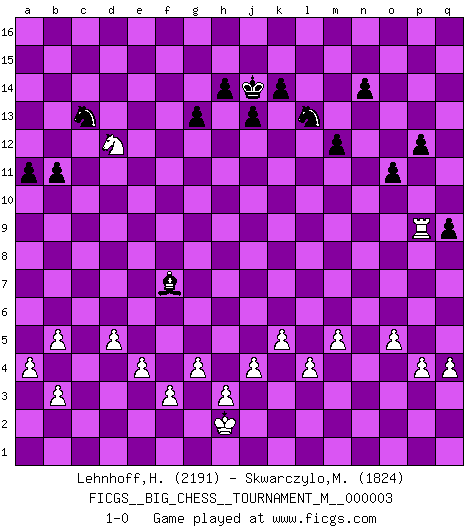 Last move : 1-0 2010 July 13 17:21:1 [Event "FICGS__BIG_CHESS__TOURNAMENT_M__000003"] [Site "FICGS"] [Date "2009.11.21"] [Round "1"] [White "Lehnhoff,Heinz-Georg"] [Black "Skwarczylo,Marek"] [Result "1-0"] [WhiteElo "2191"] [BlackElo "1824"] 1.j2-k4 j15-k13 2.h1-o7 p16-o14 3.o7-f15 g16-f14 4.f15-o7 m15-m13 5.e2-e4 l16-p12 6.f1-b5 e15-e13 7.d2-d4 f16-c13 8.m2-m4 n15-n14 9.n2-n4 o16-g9 10.l1-n3 d15-d14 11.o1-f9 k13-j11 12.h2-g4 c16-l8 13.k1-h2 e16-f16 14.l2-l3 h16-p9 15.p2-p3 m16-m14 16.c1-o12 m14-k14 17.o12-l15 k14-k7 18.o7-o6 q16-l16 19.l15-g11 b16-c14 20.p1-n2 f14-h13 21.g11-n5 g9-b4 22.c2-c3 f16-f9 23.c3-b4 f9-o9 24.o6-q4 p9-p4 25.q4-p4 l8-p4 26.q1-n1 p4-o3 27.h2-k3 k7-b7 28.a2-a4 o3-n4 29.k3-l5 n4-g10 30.b5-g10 j11-g10 31.b4-b5 a16-f16 32.g1-f3 l16-l11 33.b1-c3 f16-f9 34.j1-h2 l11-h11 35.g4-e5 k16-l14 36.n3-o4 h15-g13 37.a1-c1 c13-j7 38.c1-c2 j16-h15 39.k4-l6 j7-o12 40.n5-k8 o12-k8 41.l6-k8 f9-k9 42.k2-k4 o9-o4 43.n2-o4 k9-k8 44.c3-d5 o14-n12 45.e1-c1 h13-f12 46.c2-c7 b7-c7 47.c1-c7 o15-o13 48.m1-c1 q15-q13 49.c7-b7 c14-d16 50.c1-c15 g13-e14 51.c15-c7 a15-a14 52.f3-h4 h11-a11 53.b2-b3 a11-a8 54.f2-f3 a8-c8 55.n1-n7 c8-c7 56.b7-c7 d14-d13 57.e5-c6 e13-e12 58.q2-q4 d16-c14 59.c7-b7 b15-b13 60.d5-f6 b13-b12 61.h4-j6 k8-k6 62.n7-j7 a14-a13 63.f6-h7 k6-k11 64.h7-j9 g10-j9 65.j7-j9 p15-p13 66.j6-l7 e14-d12 67.o4-n6 d12-e10 68.o2-o4 a13-a12 69.d4-d5 a12-a11 70.j9-f9 g15-g13 71.b7-c7 e10-c11 72.c6-d8 h15-j15 73.d8-b9 d13-d12 74.b9-d10 e12-e11 75.d10-b9 e11-e10 76.f9-l9 c14-e13 77.b9-c11 k11-c11 78.c7-c11 d12-c11 79.l7-j8 e13-d11 80.j3-j4 q13-q12 81.k4-k5 p12-o11 82.j8-g9 l14-k12 83.l9-k9 k12-h11 84.g9-h11 f12-h11 85.n6-l7 p13-p12 86.l5-j6 k15-k14 87.k9-l9 n12-l13 88.j6-h8 h11-f12 89.l3-l4 j14-j13 90.o4-o5 j15-j14 91.p3-p4 q12-q11 92.m4-m5 m13-m12 93.l7-j8 l13-k11 94.l9-l15 q11-q10 95.j8-g9 o11-k15 96.l15-n15 k11-l13 97.n15-n16 j14-h13 98.n16-d16 h13-g14 99.h8-g10 e10-e9 100.g10-f12 d11-f12 101.d16-e16 k15-d9 102.e16-e9 c11-c10 103.e9-e12 b12-b11 104.e12-e11 c10-c9 105.e11-e9 d9-c10 106.e9-c9 g14-h13 107.g9-f11 f12-d11 108.c9-h9 h13-j14 109.f11-d12 c10-f7 110.h9-h10 q10-q9 111.h10-h11 d11-c13 112.h11-c11 c13-e12 113.c11-e11 e12-c13 114.g2-g4 o13-o12 115.e11-e9 o12-o11 116.e9-p9 1-0 Follow this game move after move (download)If one piece is badly posted, the whole game is bad. (Tarrasch) Je mehr wir mit Computern analysieren, desto mehr glauben wir an Verteidigung. (Vladimir Kramnik) Jugadores de primera clase pierden en contra de jugadores de segunda clase porque los jugadores de segunda clase a veces juegan una partida de primer clase. (Siegbert Tarrasch) C'est la seule position que je connaisse où les deux camps sont mals. Propos prêtés à V. Anand. Depression is just anger without enthusiasm. (Unknown)