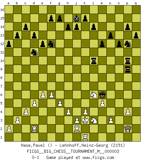 Last move : 0-1 2010 August 7 10:2:5 [Event "FICGS__BIG_CHESS__TOURNAMENT_M__000003"] [Site "FICGS"] [Date "2009.11.21"] [Round "1"] [White "Hase,Pavel"] [Black "Lehnhoff,Heinz-Georg"] [Result "0-1"] [WhiteElo ""] [BlackElo "2191"] 1.k2-k4 j15-k13 2.l2-l4 h16-o10 3.g2-g3 o10-o2 4.p1-o3 o2-c13 5.b1-c3 m15-m13 6.m2-m4 e15-e13 7.g1-f3 n15-n13 8.h2-k3 d15-d13 9.d2-d4 o16-j11 10.k1-h2 h15-g13 11.f3-h4 p16-q14 12.e2-e4 l16-p12 13.l1-o4 b16-a14 14.h4-k5 c16-h11 15.f1-g2 c13-d12 16.c1-e3 f16-a11 17.j2-h4 o15-o13 18.n2-n3 m13-m12 19.g2-f3 h11-l8 20.o1-m3 c15-c14 21.k5-m6 l8-f3 22.h2-f3 k13-l11 23.g3-g4 k16-h15 24.f3-g5 e16-e14 25.f2-f4 m16-m13 26.f4-f5 m13-j13 27.k3-j5 g13-f11 28.e4-e5 e13-e12 29.e3-f4 e14-g14 30.f5-f6 p12-m9 31.h1-d5 d12-a9 32.c3-e4 h15-k14 33.j1-k2 k14-m13 34.h4-k5 j16-j15 35.l4-l5 g16-f14 36.l5-l6 l15-l14 37.l6-l7 a14-c13 38.l7-l8 m9-l10 39.m1-l1 q14-p12 40.j5-h7 c13-d11 41.o3-n5 q16-o16 42.n5-m7 l10-n12 43.m7-k8 m13-n11 44.k5-j7 n12-m13 45.d5-b5 b15-b13 46.m3-p6 f14-h13 47.e1-e3 a11-c13 48.g5-j6 j11-h10 49.m6-n8 c13-j7 50.f4-j7 j13-j7 51.e4-g5 a9-n9 52.h3-h4 m13-k11 53.k8-l6 j7-j13 54.o4-h10 f11-h10 55.j6-l7 h13-f12 56.e3-a3 a15-a13 57.q1-o1 h10-j8 58.g5-j6 j8-l7 59.j6-l7 o13-o12 60.l6-n5 a13-a12 61.g4-g5 a16-e16 62.b5-f1 n9-b9 63.a1-b1 b9-d7 64.f1-d3 k11-l10 65.p6-m3 e16-e13 66.n5-m7 e13-h13 67.m7-k8 l10-n12 68.n8-m10 n12-q9 69.m3-l4 q9-l4 70.l1-l4 d7-g10 71.m10-n8 g10-p2 72.l4-l2 p2-q3 73.o1-n1 q3-l8 74.n8-m6 l8-m8 75.m6-k5 o16-o14 76.d4-d5 o14-q14 77.n1-n2 q14-q3 78.b1-p1 p15-p14 79.d3-d1 q15-q13 80.d1-k7 h13-h10 81.a3-c3 h10-e10 82.e5-e6 e10-d10 83.c3-d3 m8-n9 84.p1-p3 q3-p3 85.q2-p3 d10-p10 86.k7-o3 n9-f9 87.b2-b3 f9-c9 88.c2-c4 l11-j10 89.l7-j6 c9-a9 90.k2-k3 j10-k8 91.h7-k8 a9-j1 92.k5-l3 p10-o10 93.o3-p2 j1-h1 94.l2-j2 n11-l10 95.n2-k2 l10-k8 96.j6-k8 g14-g10 97.k2-k1 h1-e4 98.d3-d2 e4-g6 99.k3-k2 g6-m6 100.k8-l6 g10-l10 101.m4-m5 j13-j9 102.k2-k3 j9-p9 103.p3-p4 o10-p10 0-1 Follow this game move after move (download)Fischer is completely natural. He plays no roles. He's like a child. Very, very simple. (Zita Rajcsanyi) Schach ist ein Reich, wo sich die menschliche Phantasie frei entfalten kann. (David Bronstein) El Ajedrez es imaginación. (David Bronstein) J'ai toujours senti une vague pitié pour l'homme qui ne connaît rien aux échecs, tout comme j'en aurais pour un homme ignorant de l'amour. Les Echecs, comme la musique ou comme l'amour, ont le pouvoir de rendre heureux. (Siegbert Tarrasch) Winning isn't everything... but losing is nothing. (Mednis)