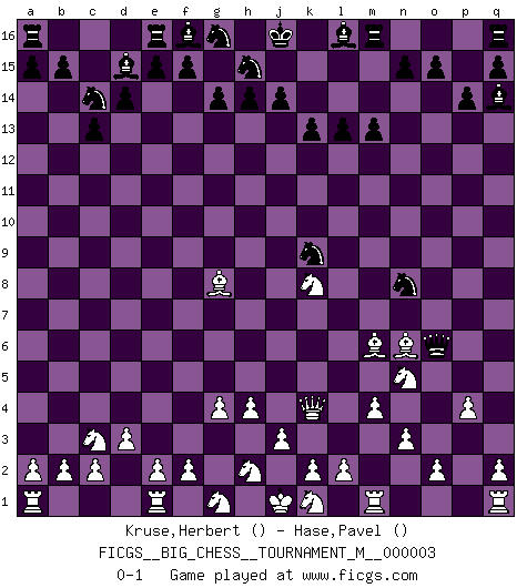 Last move : 0-1 2009 November 25 18:32:0 [Event "FICGS__BIG_CHESS__TOURNAMENT_M__000003"] [Site "FICGS"] [Date "2009.11.21"] [Round "1"] [White "Kruse,Herbert"] [Black "Hase,Pavel"] [Result "0-1"] [WhiteElo ""] [BlackElo ""] 1.g2-g4 k15-k13 2.j2-k4 p16-o14 3.d2-d3 l15-l13 4.n2-n3 k16-l14 5.o1-g8 p15-p14 6.c1-k8 d15-d14 7.h3-h4 m15-m13 8.f1-n8 g15-g14 9.h1-c6 c15-c13 10.b1-c3 h16-b10 11.c6-b5 b10-d8 12.b5-d5 d8-h12 13.p1-o3 h12-m8 14.d5-k5 b16-c14 15.n8-l6 c16-d15 16.m2-m4 l14-k12 17.l1-m2 j15-h13 18.k4-j6 k12-l10 19.m2-j5 m8-p8 20.o3-n5 l10-k8 21.j6-k8 o16-q14 22.j5-l7 h13-j11 23.l6-m5 p8-q7 24.k5-l4 j11-k9 25.l7-m6 o14-n12 26.m5-p8 q7-p7 27.p2-p4 n12-o10 28.p8-n6 o10-n8 29.l4-k4 p7-o6 0-1 Follow this game move after move (download)Openings teach you openings. Endgames teach you chess ! (Stephan Gerzadowicz) Der Knackpunkt bei der Konzentration ist, daß wir nur durch sie etwas Neues und Ungewöhnliches am Schachbrett finden können. Sie ist der einzige Weg durch neue neue Ideen eine Überraschung zu bereiten. (Garry Kasparov) El Ajedrez te enseña a controlarl la excitación inicial que sientes cuando vez algo que parece bueno y te enseña a pensar objetivamente cuando te encuentras en problemas. (Stanley Kubrick) Karpov est une pièce de musée. (Garry Kasparov) Go and wake up your luck. (Persian saying)