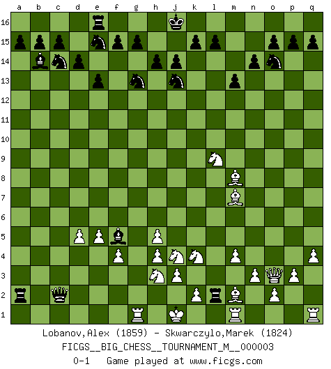 Last move : 0-1 2010 April 3 8:20:26 [Event "FICGS__BIG_CHESS__TOURNAMENT_M__000003"] [Site "FICGS"] [Date "2009.11.21"] [Round "1"] [White "Lobanov,Alex"] [Black "Skwarczylo,Marek"] [Result "0-1"] [WhiteElo "1859"] [BlackElo "1824"] 1.j2-k4 p16-o14 2.h3-h4 j15-h13 3.g1-h3 h16-o10 4.m2-m4 m15-m13 5.p1-o3 l16-o13 6.e2-e4 e15-e13 7.d2-d4 n15-n14 8.b1-c3 f16-c13 9.g2-g4 d15-d14 10.c1-h6 o16-g9 11.n2-n3 c16-k9 12.f2-f4 b16-c14 13.h2-j4 e16-e14 14.h1-p8 o13-p14 15.o1-c12 e14-f14 16.k1-l3 m16-m14 17.f1-b5 q16-m16 18.p8-b8 c13-b14 19.d4-d5 a16-e16 20.c12-j6 h15-j13 21.l1-m2 k16-h15 22.b8-e5 g9-h8 23.e5-m5 f14-f12 24.b5-g10 g16-e15 25.h6-j5 o10-p9 26.p2-p3 m14-k14 27.o3-n5 k14-k10 28.l3-k5 h13-j11 29.g10-l6 k10-b10 30.a1-b1 m16-m14 31.n5-m7 m14-l14 32.k5-l7 k9-n12 33.m7-l5 h15-g13 34.l5-k7 h8-n13 35.q2-q4 p9-o10 36.l7-k9 o10-j10 37.k9-j11 j10-j11 38.j5-m8 j11-b11 39.j6-h5 n12-g6 40.c3-d1 g6-h5 41.g4-h5 f12-m12 42.m5-n4 m12-n12 43.n4-o3 n13-b2 44.d1-b2 b10-b2 45.b1-b2 b11-b2 46.e1-g1 n12-g12 47.g1-f1 b2-c2 48.l6-m7 g12-a12 49.f1-g1 a12-a2 50.e4-e5 l14-l2 51.k7-l9 p14-f5 0-1 Follow this game move after move (download)Before the endgame, the Gods have placed the middle game. (Siegbert Tarrasch) Die Jungen erwarten, dass Opa einfach umfällt. Dann aber kann Opa fünf Stunden lang Schach spielen und die jungen Gegner an die Wand drücken. (Viktor Kortschnoi) Morphy probablemente fue el genio más grande de todos. (Bobby Fischer) Le joueur d'Echecs qui veut atteindre le top est obligé de développer son propre credo créatif. Alexeï Stepanovicth Souétine. Il est facile d'écrire des livres ! Ce qui est difficile, c'est de jouer ! (Alexeï Stepanovicth Souétine) Who needs drugs and alcohol if he can play Big Chess at FICGS ? (Heinz-Georg Lehnhoff)