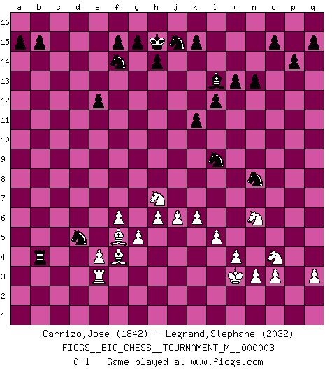 Last move : 0-1 2010 February 6 3:54:10 [Event "FICGS__BIG_CHESS__TOURNAMENT_M__000003"] [Site "FICGS"] [Date "2009.11.21"] [Round "1"] [White "Carrizo,Jose"] [Black "Legrand,Stephane"] [Result "0-1"] [WhiteElo "1842"] [BlackElo "2032"] 1.j2-k4 p16-o14 2.h1-o7 h15-g13 3.o7-c7 j14-j13 4.c7-c15 e15-e13 5.c15-c6 d15-d13 6.c2-c3 b16-c14 7.d2-d4 c16-h11 8.c6-l6 k16-l14 9.l6-d13 a16-d16 10.d13-h9 m15-m13 11.h9-b9 h16-h15 12.b9-h15 j16-h15 13.b2-b3 n15-n13 14.c1-b2 f16-b12 15.c3-c4 o16-f8 16.e2-e3 l16-o13 17.b1-c3 d16-d9 18.n2-n3 h11-e8 19.k2-k3 d9-j9 20.g1-j2 e16-d16 21.j1-h1 d16-d10 22.h3-h4 d10-j10 23.h2-j4 o13-f5 24.k1-l3 g16-f14 25.f2-f3 m16-d16 26.g2-g4 f5-g6 27.h4-h5 g6-m11 28.c3-e4 d16-d12 29.e4-f6 e8-f9 30.o1-f9 j9-f9 31.d4-d5 d12-q12 32.p1-n2 f9-q9 33.q2-q3 m11-j8 34.n2-o4 q12-p12 35.m2-m4 f8-h10 36.j4-k6 j8-p2 37.o4-p2 p12-p2 38.m1-o1 b12-j5 39.j2-h4 j5-k6 40.k4-m5 k6-h8 41.h4-j6 h8-m12 42.m5-o4 p2-p7 43.l3-m5 q9-f9 44.g4-g5 p7-a7 45.b2-d4 a7-a8 46.f1-k5 f9-a9 47.e1-e2 h10-j9 48.j6-h4 e13-e12 49.d4-e5 a9-a11 50.q1-p1 p15-p14 51.p1-p10 j10-p10 52.k5-p10 q16-d16 53.l1-m2 d16-d12 54.a2-a4 d12-d13 55.a1-b1 d13-b13 56.e2-b2 a11-b11 57.p10-k5 b13-b14 58.f3-f4 a8-a7 59.h4-f3 g13-f11 60.f3-d4 f11-g9 61.d4-b5 a7-p7 62.h1-j2 g9-j8 63.h5-h6 l14-k12 64.m2-k4 c14-e13 65.b2-h2 o14-n12 66.o1-p1 b11-p11 67.h2-h1 b14-b11 68.k4-j5 p11-p9 69.o4-n6 p7-p2 70.h1-o1 b11-l11 71.j2-k2 n12-o10 72.m5-o4 p2-p1 73.o1-p1 l11-p11 74.p1-p9 p11-p9 75.k2-l3 j8-l9 76.l3-m2 o10-n8 77.j5-k4 p9-p13 78.f4-f5 n8-m6 79.k5-m3 l9-k7 80.e3-e4 k12-m11 81.e5-g3 l15-l13 82.l2-l4 l13-l12 83.l4-l5 m6-n8 84.j3-j4 m11-l9 85.j4-j5 m12-o10 86.f6-h7 j9-l11 87.b1-j1 e13-f11 88.k4-l3 f11-e9 89.k3-k4 e9-d7 90.g3-d6 l11-k12 91.d6-k12 j13-k12 92.b5-d4 k12-k11 93.k4-k5 o10-m12 94.f5-f6 k7-h8 95.k5-k6 h8-f7 96.d4-e6 p13-p10 97.j5-j6 p10-b10 98.j1-j3 f7-d6 99.j3-e3 d6-b7 100.e6-d4 b7-a5 101.l3-j1 d7-c5 102.m3-k1 m12-l13 103.d4-b5 a5-b3 104.j1-c7 b3-d2 105.e3-e2 d2-c4 106.e2-c2 c4-e3 107.c2-e2 c5-a4 108.e2-e3 b10-b5 109.c7-f4 b5-b2 110.m2-m3 a4-b6 111.o2-o3 b2-b4 112.k1-f5 b6-d5 0-1 Follow this game move after move (download)White lost because he failed to remember the right continuation and had to think up the moves himself. (Siegbert Tarrasch) Wer der Ansicht ist, daß alle Schachspieler verrückt sind, wird durch Studium des Lebens von Emil Josef Diemer nicht auf andere Gedanken kommen. (Hans Ree) El Ajedrez tiene tanto misterio como las mujeres. (Purdy) Echiquier : carré parfait, comme la Jérusalem nouvelle décrite par l'auteur de l'Apocalypse, huit cases sur huit, exaltation du chiffre 4, symbole du cosmos aux quatre horizons... où le noir et le blanc, l'ombre et la lumière, le mal et le bien s'entremêlent et se conjuguent. (Robert Couffignal, Le Gambit du poète) 'preceded by its own quotation yields a falsehood' preceded by its own quotation yields a falsehood. (W. V. O. Quine - Set Theory And Its Logic, 1953)