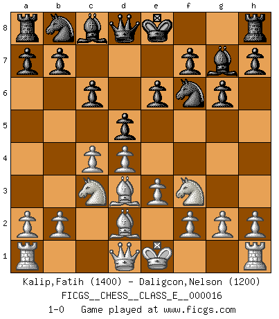 Last move : 1-0 2006 December 11 11:55:8 [Event "FICGS__CHESS__CLASS_E__000016"] [Site "FICGS"] [Date "2006.10.04"] [Round "1"] [White "Kalip,Fatih"] [Black "Daligcon,Nelson"] [Result "1-0"] [WhiteElo "1400"] [BlackElo "1200"] 1.d4 d5 2.Nf3 Nf6 3.c4 c6 4.Nc3 g6 5.e3 e6 6.Bd3 Bg7 7.Bd2 1-0 This chess game has been lost on time (started : 2006.10.04 9:7:59) Queen's pawn game Player White won this chess game. Follow this game move after move (download)No price is too great for the scalp of the enemy King. (Koblentz) Bogoljubow: Matt in vier Zügen! Tartakower: Ich verbitte mir jede Belästigung! (Savielly Grigorievitsch Tartakower) Solo puedes ser bueno en el Ajedrez si amas al juego. (Bobby Fischer) Les échecs sont plus proches de l'art de l'assassinat que de l'art de la guerre. (Arturo Perez-Reverte) Dave, my mind is going. I can feel it. (HAL 9000 in 2001, a space odyssey)
