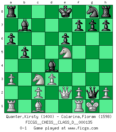 Last move : 0-1 2009 December 13 12:18:56 [Event "FICGS__CHESS__CLASS_D__000135"] [Site "FICGS"] [Date "2009.11.22"] [Round "1"] [White "Quanter,Kirsty"] [Black "Colarina,Floram"] [Result "0-1"] [WhiteElo "1400"] [BlackElo "1598"] 1.e4 c5 2.Nf3 Nc6 3.Bb5 Qb6 4.Qe2 a6 5.Bxc6 Qxc6 6.d3 e6 7.O-O b5 8.a3 d6 9.b4 Be7 10.e5 Bb7 11.exd6 Bxd6 12.bxc5 Bxc5 13.Nc3 Bd4 14.Ne5 Qxg2+ 0-1 Sicilian : Nimzovich-Rossolimo attack (without ...d6) Kingside Castling by player White (move 7) Player Black won this chess game. Follow this game move after move (download)The winner of the game is the player who makes the next-to-last mistake. (Savielly Tartakover) Es ist im Leben wie im Schachspiel. Wir entwerfen einen Plan, dieser bleibt jedoch bedingt durch das, was im Schachspiel dem Gegner, im Leben dem Schicksal zu tun belieben wird. (Arthur Schopenhauer) Un sacrificio se refuta mucho mejor al aceptarlo. (Wilhelm Steinitz) Lorsque vous vous retrouvez devant une position atroce, ne tendez pas un ultime piège dérisoire avec l'intention d'abandonner si l'adversaire le déjoue ! Faites-vous plutôt un devoir de résister comme si votre vie en dépendait. Jouez le coup qui vous déplairait au centuple si vous étiez dans la peau de votre tortionnaire ! If you are going through hell, keep going. (Winston Churchill)