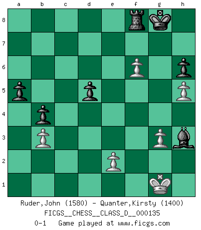 Last move : 0-1 2009 December 13 20:14:47 [Event "FICGS__CHESS__CLASS_D__000135"] [Site "FICGS"] [Date "2009.11.22"] [Round "1"] [White "Ruder,John"] [Black "Quanter,Kirsty"] [Result "0-1"] [WhiteElo "1580"] [BlackElo "1400"] 1.Nf3 d5 2.d4 Nc6 3.Nc3 Nf6 4.Ne5 e6 5.h4 Ne4 6.h5 Nxc3 7.bxc3 h6 8.g3 Nxe5 9.dxe5 g5 10.Bh3 c6 11.a4 a5 12.O-O b5 13.axb5 cxb5 14.Ba3 Bxa3 15.Rxa3 f6 16.exf6 Qxf6 17.f4 O-O 18.c4 b4 19.Rb3 dxc4 20.Qd5 cxb3 21.cxb3 Ra6 22.fxg5 exd5 23.Rxf6 Raxf6 24.gxf6 Bxh3 0-1 Reti Opening Kingside Castling by player White (move 12) Kingside Castling by player Black (move 17) Player Black won this chess game. Follow this game move after move (download)There is no remorse like the remorse of Chess. (H. G. Wells) Ich verstehe Aljechins Kombinationen ganz gut; aber woher er diese Angriffschancen bekommt und wie er die Eröffnung behandelt das ist für mich ein Buch mit sieben Siegeln. (Rudolf Spielmann) El Ajedrez es un juego terrible. Si no dominas el centro, tu oponente tiene una posición mas libre. Si tu tienes el centro, entonces realmente tienes algo de que preocuparte. (Siegbert Tarrasch) Toute estimation doit être constamment réévaluée. (Jacob Estrin) Without enthusiasm, virtue functions not at all, and vice only poorly. (Mignon McLaughlin, The Neurotic's Notebook, 1960)
