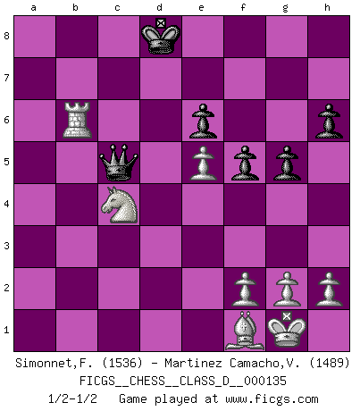 Last move : 1/2-1/2 2010 January 29 17:11:36 [Event "FICGS__CHESS__CLASS_D__000135"] [Site "FICGS"] [Date "2009.11.22"] [Round "1"] [White "Simonnet,Franck"] [Black "Martinez Camacho,Victor Hugo"] [Result "1/2-1/2"] [WhiteElo "1536"] [BlackElo "1489"] 1.d4 Nf6 2.c4 e6 3.Nc3 d5 4.Bg5 Be7 5.cxd5 Nxd5 6.Bxe7 Qxe7 7.e4 Nxc3 8.bxc3 O-O 9.Nf3 Bd7 10.Bc4 b5 11.Bd3 a6 12.O-O Nc6 13.a4 bxa4 14.Rxa4 a5 15.Qa1 Rfb8 16.Re1 h6 17.d5 Nd8 18.Rxa5 Rxa5 19.Qxa5 c6 20.Qc7 Rb2 21.d6 Qf8 22.Qxd7 c5 23.Ra1 Rb7 24.Qxb7 Nxb7 25.e5 f6 26.Be4 Nd8 27.Ra6 Qe8 28.Ra7 f5 29.Bd3 Nc6 30.Rc7 Qa8 31.d7 Qa1+ 32.Bf1 Nd8 33.Rc8 Qa5 34.Nd2 Kf7 35.Nc4 Qxc3 36.Rxd8 Ke7 37.Rc8 Kxd7 38.Rxc5 Qb4 39.Ra5 g5 40.Ra7+ Kd8 41.Rh7 Qf8 42.Ra7 Qc5 43.Ra5 Qb4 44.Ra6 Ke7 45.Rb6 Qc5 46.Rb7+ Kd8 47.Rb6 1/2-1/2 Queen's pawn game Kingside Castling by player Black (move 8) Kingside Castling by player White (move 12) This chess game ended in a draw. Follow this game move after move (download)I'm not a materialistic person, in that, I don't suffer the lack or loss of money. The absence of worldly goods I don't look back on. For Chess is a way I can be as materialistic as I want without having to sell my soul. (Jamie Walter Adams) Im Wettkampf zwischen starken Meistern kommen Fehler sehr selten vor, deshalb ist es mit bloßem Warten nicht getan. (José Raúl Capablanca) No volvere nunca a jugar contigo. Has insultado a mi amigo. - cuando un oponente se maldijo por una mala jugada (Miguel Najdorf) Les écrivains ont utilisé les échecs pour analyser les côtés extrêmes de la nature humaine. Dans ce cadre, les échecs offrent un champ d'expérimentation idéal. Mais on pourrait faire la même chose avec la peinture. Et là, en vous référant à Van Gogh, vous ne tirerez pas de conclusion définitive sur les peintres. (Gary Kasparov) Life is verb, not a noun. (Charlotte Perkins Gilman)