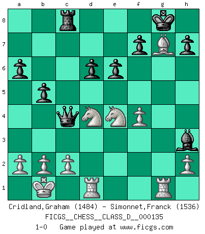 Last move : 1-0 2010 January 13 8:54:15 [Event "FICGS__CHESS__CLASS_D__000135"] [Site "FICGS"] [Date "2009.11.22"] [Round "1"] [White "Cridland,Graham"] [Black "Simonnet,Franck"] [Result "1-0"] [WhiteElo "1484"] [BlackElo "1536"] 1.e4 c5 2.Nf3 d6 3.d4 cxd4 4.Nxd4 Nf6 5.Nc3 a6 6.Bg5 e6 7.f4 Be7 8.Qf3 O-O 9.O-O-O Qc7 10.Bd3 Nbd7 11.Rhe1 b5 12.Qh3 Nc5 13.Kb1 Bb7 14.e5 Nxd3 15.exf6 Nf2 16.fxe7 Nxh3 17.exf8Q+ Rxf8 18.gxh3 Bg2 19.Rg1 Bxh3 20.Bh6 Rc8 21.Bxg7 Qc4 22.Ne4 1-0 Sicilian : Najdorf, 7...Be7 Kingside Castling by player Black (move 8) Queenside Castling by player White (move 9) Promotion Queen by player White (move 17) Player White won this chess game. Follow this game move after move (download)Best by test: 1. e4 (Bobby Fischer) Im Hotelzimmer gab es nur zwei Schaben. (Über die Turnierbedingungen) (Peter Swidler) Cuando la partida de Ajedrez termina, el Peón y el Rey regresan a la misma caja. (Irish saying) Les ravages du H expliquent la différence de niveau entre Tal et Thal [Abergel]. Good decisions come from experience, and experience comes from bad decisions. (Anonymous)