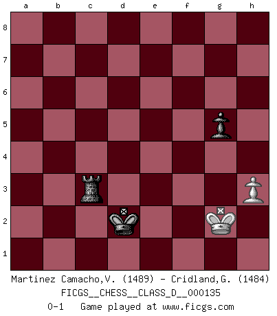 Last move : 0-1 2010 February 8 3:51:11 [Event "FICGS__CHESS__CLASS_D__000135"] [Site "FICGS"] [Date "2009.11.22"] [Round "1"] [White "Martinez Camacho,Victor Hugo"] [Black "Cridland,Graham"] [Result "0-1"] [WhiteElo "1489"] [BlackElo "1484"] 1.d4 Nf6 2.c4 c6 3.Nc3 d5 4.Nf3 dxc4 5.e4 b5 6.e5 Nd5 7.a4 e6 8.Be2 Bb7 9.axb5 Nxc3 10.bxc3 cxb5 11.Bg5 Be7 12.Qd2 Nc6 13.O-O O-O 14.Rfd1 Bxg5 15.Qxg5 Qxg5 16.Nxg5 h6 17.Ne4 Ne7 18.Nd6 Bc6 19.Rdb1 a6 20.h3 Nc8 21.Nxc8 Rfxc8 22.Ra5 Be4 23.Rba1 Bb7 24.g3 Kf8 25.Bf1 Rab8 26.Bg2 Bxg2 27.Kxg2 b4 28.cxb4 c3 29.Rc1 Rxb4 30.Rxa6 Rxd4 31.Ra3 c2 32.Ra2 Rdc4 33.f4 g5 34.Kf3 Kg7 35.fxg5 hxg5 36.g4 Rf4+ 37.Kg3 Rc3+ 38.Kg2 Rfc4 39.Rb2 Kg6 40.Kh2 Rc5 41.Kg2 f5 42.gxf5+ exf5 43.Rb6+ Kf7 44.e6+ Ke7 45.Rb7+ Kxe6 46.Rb6+ Kf7 47.Rd6 f4 48.Rd7+ Ke6 49.Rd2 Ke5 50.Re2+ Kd4 51.Rd2+ Ke3 52.Rd8 f3+ 53.Kg3 Ke2 54.Rf8 f2 55.Kg2 Kd2 56.Rf1 c1Q 57.R8xf2+ Kd3 58.Rf3+ Kc4 59.Rxc1 Rxc1 60.Re3 Kd4 61.Re8 R1c3 62.Rd8+ Rd5 63.Ra8 Ke4 64.Ra4+ Rd4 65.Ra2 Ke3 66.Rf2 Rd2 67.Rxd2 Kxd2 0-1 Queen's pawn game Kingside Castling by player White (move 13) Kingside Castling by player Black (move 13) 10 pieces endgame at move 45 : White KRRP , Black KRRPPP WHITE : King + 2 Rooks 1 Pawn BLACK : King + 2 Rooks 3 Pawns Promotion Queen by player Black (move 56) 9 pieces endgame at move 57 : White KRRP , Black KQRRP WHITE : King + 2 Rooks 1 Pawn BLACK : King + 1 Queen 2 Rooks 1 Pawn 8 pieces endgame at move 59 : White KRRP , Black KRRP WHITE : King + 2 Rooks 1 Pawn BLACK : King + 2 Rooks 1 Pawn 7 pieces endgame at move 59 : White KRP , Black KRRP WHITE : King + 1 Rook 1 Pawn BLACK : King + 2 Rooks 1 Pawn 6 pieces endgame at move 67 : White KRP , Black KRP WHITE : King + 1 Rook 1 Pawn BLACK : King + 1 Rook 1 Pawn 5 pieces endgame at move 67 : White KP , Black KRP WHITE : King + 1 Pawn BLACK : King + 1 Rook 1 Pawn Player Black won this chess game. Follow this game move after move (download)The Pin is mightier than the sword. (Fred Reinfeld) Auf Remis zu spielen ist gewissermaßen ein Verbrechen gegen das Schachspiel. (Mikhail Nekhemyevich Tal) El Ajedrez se juega con la mente... ¡no con las manos!. (Renaud y Kahn) Assurément je connaissais par expérience le mystérieux attrait de ce jeu royal, le seul entre tous les jeux inventés par les hommes qui échappe souverainement à la tyrannie du hasard, le seul où l'on ne doive sa victoire qu'à son intelligence ou plutôt à une certaine forme d'intelligence. Mais n'est-ce pas déjà le limiter injurieusement que d'appeler les échecs un jeu ? N'est-ce pas une science, un art ou quelque chose qui, comme le cercueil de Mahomet entre ciel et terre, est suspendu entre l'un et l'autre, et qui réunit un nombre incroyable de contraires ? [...] C'est une pensée qui ne mène à rien, une mathématique qui n'établit rien, un art qui ne laisse pas d'uvre, une architecture sans matière; et il l'a prouvé néanmoins qu'il était plus durable, à sa manière, que les livres ou que tout autre monument, ce jeu unique qui appartient à tous les peuples et à tous les temps, et dont personne ne sait quel dieu en fit don à la terre pour tuer l'ennui, pour aiguiser l'esprit et stimuler l'âme. Où commence-t-il, où finit-il ? (Stefan Zweig) Looking at the proliferation of personal web pages on the Net, it looks like very soon everyone on Earth will have 15 megabytes of fame. (M.G. Sriram)