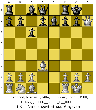 Last move : 1-0 2009 December 13 22:0:10 [Event "FICGS__CHESS__CLASS_D__000135"] [Site "FICGS"] [Date "2009.11.22"] [Round "1"] [White "Cridland,Graham"] [Black "Ruder,John"] [Result "1-0"] [WhiteElo "1484"] [BlackElo "1580"] 1.e4 e5 2.Nf3 Nc6 3.Bb5 Nf6 4.O-O Nxe4 5.d4 Nxd4 6.Nxd4 exd4 7.Qxd4 c6 8.Qxe4+ Be7 9.Bd3 O-O 10.Qxh7+ 1-0 Ruy Lopez : Berlin defense, Open variation Kingside Castling by player White (move 4) Kingside Castling by player Black (move 9) Player White won this chess game. Follow this game move after move (download)One doesn't have to play well, it's enough to play better than your opponent. (Siegbert Tarrasch) Ich verlor meine Bürgerrechte, mein Gehalt wurde mir nicht mehr bezahlt und ich wurde zensiert und durfte nicht mehr ins Ausland reisen. [nach dem Match Fischer-Taimanov 6:0] (Mark Taimanov) El Ajedrez es un juego terrible. Si no dominas el centro, tu oponente tiene una posición mas libre. Si tu tienes el centro, entonces realmente tienes algo de que preocuparte. (Siegbert Tarrasch) Celui qui prend des risques peut perdre, celui qui n'en prend pas perd toujours. (Xavier Tartacover) Even the best needles are not sharp at both ends. (Chinese proverb)