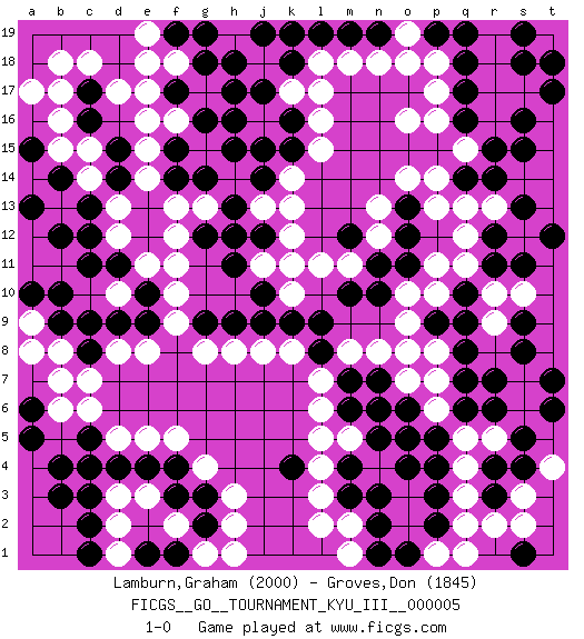 Last move : 1-0 2010 February 21 0:24:51 [Event "FICGS__GO__TOURNAMENT_KYU_III__000005"] [Site "FICGS"] [Date "2009.11.22"] [Round "1"] [Black "Lamburn,Graham"] [White "Groves,Don"] [Result "1-0"] [Rating 1 "2000"] [Rating 2 "1845"] 1.q16 d17 2.d4 r5 3.d15 f16 4.c17 c18 5.c16 b18 6.c11 k17 7.k4 c6 8.c8 c4 9.c3 d3 10.b3 d5 11.e4 e3 12.b4 e5 13.f4 f5 14.f3 e8 15.p4 q3 16.p3 q2 17.q6 q5 18.p5 p6 19.q7 p7 20.q8 p8 21.q9 o10 22.r14 q11 23.r11 r10 24.q10 p11 25.r12 s10 26.s9 r9 27.s8 d13 28.c13 d12 29.c12 d10 30.d11 e11 31.e10 f10 32.e9 f9 33.d9 d8 34.c9 n4 35.n5 o5 36.n3 m5 37.o4 n6 38.m4 l4 39.m3 l3 40.n5 l5 41.o6 o7 42.p2 p1 43.o1 q1 44.n2 f11 45.s4 s3 46.r4 q4 47.r3 s2 48.s5 s6 49.r6 r2 50.t6 s7 51.t7 g4 52.g3 h3 53.s1 f2 54.g2 h2 55.c5 g1 56.c4 d2 57.c2 d1 58.c1 l2 59.o5 t4 60.r7 o16 61.k15 l15 62.k16 l16 63.j17 k14 64.h15 j16 65.j15 l18 66.k18 l17 67.h16 g17 68.h13 j13 69.j12 k12 70.j14 k13 71.f15 e16 72.h12 e15 73.f14 c14 74.d14 e14 75.h17 c15 76.j10 k11 77.h9 b6 78.e1 b8 79.b9 r17 80.q17 r16 81.r15 p14 82.q18 r18 83.s16 s17 84.s15 q15 85.t18 k10 86.k9 k8 87.g16 g13 88.g14 h8 89.l9 j8 90.j9 r19 91.q19 p16 92.t17 p17 93.s19 p18 94.s18 c7 95.b14 b15 96.m10 a9 97.a10 a8 98.b10 b13 99.b12 m8 100.l8 l7 101.m12 m11 102.n11 l11 103.n10 n12 104.n7 n8 105.m6 q13 106.p9 o8 107.m7 l6 108.n6 r13 109.s13 s12 110.s11 q12 111.t12 o9 112.o11 p10 113.o12 n13 114.o13 o14 115.q14 p13 116.a13 j18 117.h18 m2 118.a15 b16 119.a16 b17 120.f17 f13 121.j19 j11 122.h11 f18 123.g18 e17 124.f19 e18 125.p19 o19 126.n19 o18 127.l19 n18 128.f1 h1 129.m19 m18 130.k19 e19 131.g19 a17 132.g9 a14 133.a15 g8 134.a5 m1 135.a6 b7 136.g12 f12 137.n1 1-0 Here are the names of the openings (joseki) played in the four corners : Corner d16 : d17 d15 Komoku (Somok, Xiao~mu`) 3-4 Point. The komoku (3-4) point is the traditional corner enclosure move.. Ikken Takagakari (Hankan Nop'dakeolch'im, Yi Gaogua`jiao~, 1-Space High Approach). The 5-4 approach move has become more popular in modern times, as modern Go emphasizes speed and influence. Corner d4 : d4 c6 Hoshi (Hwajeom, Seongjeom, Xingwei`) 4-4 Point. The star or hoshi (4-4) point, emphasizing influence at the potential expense of territory. Ikken Kakari (Hankan Keolch'im, Yi Gua`jiao~, 1-Space Low Approach). White 2 is the standard approach move to the 4-4. Corner q4 : r5 p4 Mokuhazushi (Waemok, Wai`mu`) 5-3 Point. The mokuhazushi (5-3) point was popular in the Edo period in Japan (1600 - 1867). It emphasizes influence; territorially, it is inferior to the 3-4 point. Takamoku Kakari. Black prevents White from gaining influence, but in the local context, abandoning profit in the corner entails a loss. White 3-4 and 4-4 are best. Player Black won this Go (weiqi, baduk) game. Follow this game move after move (download)The saki bottle shape is negative. (Anonymous) All politicians must be presumed guilty until they are proven innocent. (Dinesh De Silva)