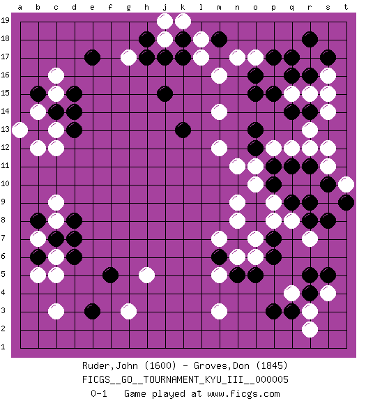 Last move : 0-1 2010 February 23 21:16:20 [Event "FICGS__GO__TOURNAMENT_KYU_III__000005"] [Site "FICGS"] [Date "2009.11.22"] [Round "1"] [Black "Ruder,John"] [White "Groves,Don"] [Result "0-1"] [Rating 1 "1600"] [Rating 2 "1845"] 1.p3 c16 2.e17 q15 3.p17 c5 4.e3 g17 5.d15 c15 6.d14 c13 7.d13 c12 8.c14 b14 9.b13 b12 10.b15 a13 11.j17 m16 12.m18 l17 13.j15 n17 14.r16 g3 15.f5 h5 16.d6 m3 17.o15 p16 18.o16 o17 19.q17 c6 20.d7 c8 21.d8 m14 22.o13 m12 23.k13 r12 24.q14 r15 25.p15 s14 26.r14 s16 27.q16 s15 28.q11 q12 29.p11 p12 30.o12 n11 31.s17 o11 32.r11 s11 33.s10 s12 34.r9 j18 35.k18 l18 36.k17 k19 37.h18 j19 38.h17 r7 39.o9 n9 40.o8 n8 41.n7 o7 42.p7 o6 43.p6 q8 44.o5 n6 45.q9 p8 46.s8 p9 47.r8 r3 48.n5 o10 49.p10 t10 50.t9 r13 51.r18 m5 52.m6 m7 53.r4 q4 54.q3 s4 55.r5 r2 56.s5 c3 57.c7 b7 58.b8 c9 59.b6 b5 0-1 This go game has been lost on time (started : 2009.11.22 2:6:35) Here are the names of the openings (joseki) played in the four corners : Corner d16 : c16 e17 Komoku (Somok, Xiao~mu`) 3-4 Point. The komoku (3-4) point is the traditional corner enclosure move.. Ikken Kakari (Hankan Keolch'im, Yi Gua`jiao~, 1-Space Low Pincer). The small knight move is the basic approach move to the 3-4 point stone. It has been continually used for over four centuries. There are limitless variations, with new moves constantly being discovered. Black 2 opens the door to a treaure store of joseki. Corner q16 : q15 p17 Takamoku (Gomok, Gaomu`) 5-4 Point. The takamoku (high) point (5-4). With its emphasis on influence, the 5-4 point complements the 4-4 (hoshi) point in creating an influence-oriented fuseki. Corner d4 : c5 e3 Mokuhazushi (Waemok, Wai`mu`) 5-3 Point. The mokuhazushi (5-3) point was popular in the Edo period in Japan (1600 - 1867). It emphasizes influence; territorially, it is inferior to the 3-4 point. Corner q4 : p3 m3 Mokuhazushi (Waemok, Wai`mu`) 5-3 Point. The mokuhazushi (5-3) point was popular in the Edo period in Japan (1600 - 1867). It emphasizes influence; territorially, it is inferior to the 3-4 point. Player White won this Go (weiqi, baduk) game. Follow this game move after move (download)Eyes win semiais. (Anonymous) The Movers & Shakers of this world are those who play chess in the mornings and go to the disco in the evenings. (Dinesh De Silva)
