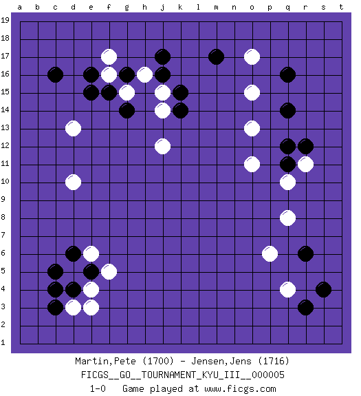 Last move : 1-0 2010 February 23 21:16:20 [Event "FICGS__GO__TOURNAMENT_KYU_III__000005 "] [Site "FICGS"] [Date "2009.11.22"] [Round "1"] [Black "Martin,Pete "] [White "Jensen,Jens "] [Result "1-0"] [Rating 1 "1700"] [Rating 2 "1716"] 1.q16 q4 2.c16 d5 3.j17 d13 4.e16 d10 5.c3 e3 6.d4 e4 7.c5 d3 8.c4 o17 9.m17 o15 10.q14 o13 11.d6 e6 12.e5 f5 13.r6 p6 14.s4 q8 15.r3 r11 16.q12 o11 17.q11 q10 18.r12 f16 19.f15 g15 20.e15 f17 21.g16 h16 22.j16 j15 23.k15 j14 24.k14 j12 25.g14 1-0 This go game has been lost on time (started : 2009.11.22 2:6:35) Here are the names of the openings (joseki) played in the four corners : Corner d4 : d5 c3Takamoku (Gomok, Gaomu`) 5-4 Point. The takamoku (high) point (5-4). With its emphasis on influence, the 5-4 point complements the 4-4 (hoshi) point in creating an influence-oriented fuseki.San-san. Black plays the 3-3 when White has a stone at top such as marked. Corner q16 : q16 o17Hoshi (Hwajeom, Seongjeom, Xingwei`) 4-4 Point. The star or hoshi (4-4) point, emphasizing influence at the potential expense of territory.Ikken Kakari (Hankan Keolch'im, Yi Gua`jiao~, 1-Space Low Approach). White 2 is the standard approach move to the 4-4. Corner q4 : q4 r6Hoshi (Hwajeom, Seongjeom, Xingwei`) 4-4 Point. The star or hoshi (4-4) point, emphasizing influence at the potential expense of territory.Ikken Kakari (Hankan Keolch'im, Yi Gua`jiao~, 1-Space Low Approach). Black 2 is the standard approach move to the 4-4. Player Black won this Go (weiqi, baduk) game.Follow this game move after move (download ) Extend one hand from the cutting points. (Anonymous) To send light into the darkness of men's hearts - such is the duty of the artist. (Schumann)