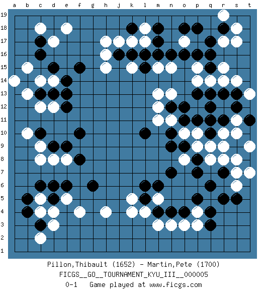 Last move : 0-1 2010 January 31 0:20:13 [Event "FICGS__GO__TOURNAMENT_KYU_III__000005"] [Site "FICGS"] [Date "2009.11.22"] [Round "1"] [Black "Pillon,Thibault"] [White "Martin,Pete"] [Result "0-1"] [Rating 1 "1652"] [Rating 2 "1700"] 1.q17 d4 2.q4 d17 3.d15 d12 4.c17 c18 5.c16 e18 6.c13 c12 7.q11 o3 8.q6 l4 9.c6 c8 10.e6 f4 11.d9 d8 12.e9 e8 13.g6 h4 14.f8 c9 15.f10 c5 16.d5 e5 17.d6 r15 18.p16 r17 19.r18 s17 20.p18 p14 21.k16 h17 22.k18 c14 23.b14 b13 24.f15 r9 25.o11 s7 26.s5 s11 27.r13 s14 28.q15 p12 29.p11 r12 30.q12 q14 31.q13 r14 32.s13 s18 33.n4 n3 34.o4 p3 35.q3 p4 36.p5 p15 37.q16 n15 38.n16 m15 39.m16 p9 40.o9 o8 41.p8 q8 42.p7 o10 43.n9 p10 44.n10 r10 45.q10 q9 46.r7 s6 47.r5 t9 48.c10 b10 49.s9 b15 50.s8 r8 51.t8 s10 52.t11 t13 53.s12 n11 54.n12 m11 55.p13 m12 56.d13 n13 57.r11 t7 58.o12 s8 59.n7 h15 60.e12 d14 61.e13 a14 62.e14 k15 63.m4 m3 64.l10 l17 65.l16 k17 66.j16 j17 67.m17 o17 68.o16 l18 69.m18 r19 70.o18 h16 71.c3 d3 72.b5 c4 73.b4 c2 74.l5 m5 75.m6 k5 76.l6 k4 77.l15 m13 0-1 Here are the names of the openings (joseki) played in the four corners : Corner d16 : d17 d15 Komoku (Somok, Xiao~mu`) 3-4 Point. The komoku (3-4) point is the traditional corner enclosure move.. Ikken Takagakari (Hankan Nop'dakeolch'im, Yi Gaogua`jiao~, 1-Space High Approach). The 5-4 approach move has become more popular in modern times, as modern Go emphasizes speed and influence. Corner q4 : q4 o3 Hoshi (Hwajeom, Seongjeom, Xingwei`) 4-4 Point. The star or hoshi (4-4) point, emphasizing influence at the potential expense of territory. Ikken Kakari (Hankan Keolch'im, Yi Gua`jiao~, 1-Space Low Approach). White 2 is the standard approach move to the 4-4. Corner d4 : d4 c6 Hoshi (Hwajeom, Seongjeom, Xingwei`) 4-4 Point. The star or hoshi (4-4) point, emphasizing influence at the potential expense of territory. Ikken Kakari (Hankan Keolch'im, Yi Gua`jiao~, 1-Space Low Approach). Black 2 is the standard approach move to the 4-4. Player White won this Go (weiqi, baduk) game. Follow this game move after move (download)If you have lost four corners, resign. (Anonymous) There is a very easy way to return from a casino with a small fortune : go there with a large one. (Jack Yelton)