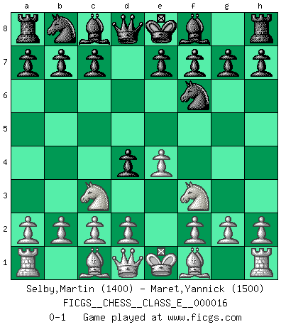 Last move : 0-1 2006 December 3 16:53:49 [Event "FICGS__CHESS__CLASS_E__000016"] [Site "FICGS"] [Date "2006.10.04"] [Round "1"] [White "Selby,Martin"] [Black "Maret,Yannick"] [Result "0-1"] [WhiteElo "1400"] [BlackElo "1500"] 1.e4 Nf6 2.Nc3 d5 3.Nf3 d4 0-1 Alekhine's defense : Scandinavian variation Player Black won this chess game. Follow this game move after move (download)No one ever won a game by resigning. (Unknown) Der Schachmeister von Heute braucht Courage, einen Killerinstinkt, Ausdauer und Arroganz. (Larry Evans) Ciertamente, de todas la drogas del mundo, el Ajedrez debe ser el mas placentero permamentemente. (Assiac) Les Echecs ne sont pas pour les âmes timides. Ils requièrent un homme entier, qui ne s'arrête pas aveuglément à ce qui a été déjà établi, mais qui tente individuellement de sonder les profondeurs du jeu. (W. Steinitz) Every now and then a man's mind is stretched by a new idea and never shrinks back to its former dimensions. (Oliver Wendell Holmes, Sr.)