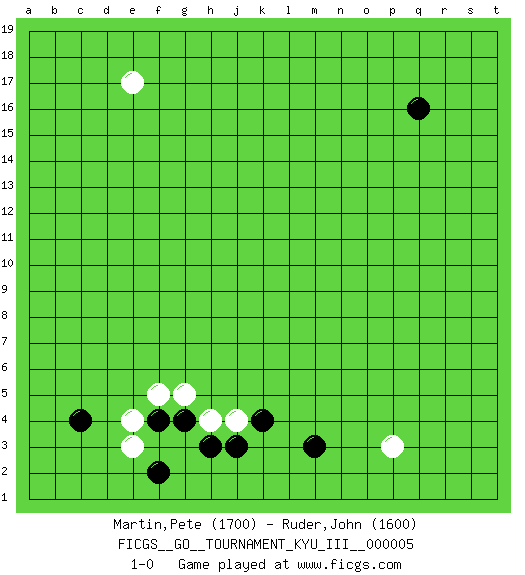 Last move : 1-0 2010 January 6 20:30:25 [Event "FICGS__GO__TOURNAMENT_KYU_III__000005 "] [Site "FICGS"] [Date "2009.11.22"] [Round "1"] [Black "Martin,Pete "] [White "Ruder,John "] [Result "1-0"] [Rating 1 "1700"] [Rating 2 "1600"] 1.q16 e17 2.c4 e3 3.j3 p3 4.m3 h4 5.h3 j4 6.k4 f5 7.g4 g5 8.f4 e4 9.f2 1-0 This go game has been lost on time (started : 2009.11.22 2:6:35) Here are the names of the openings (joseki) played in the four corners : Corner d4 : c4 e3Komoku (Somok, Xiao~mu`) 3-4 Point. The komoku (3-4) point is the traditional corner enclosure move..Ikken Kakari (Hankan Keolch'im, Yi Gua`jiao~, 1-Space Low Pincer). The small knight move is the basic approach move to the 3-4 point stone. It has been continually used for over four centuries. There are limitless variations, with new moves constantly being discovered. White 2 opens the door to a treaure store of joseki. Corner q4 : p3 m3Mokuhazushi (Waemok, Wai`mu`) 5-3 Point. The mokuhazushi (5-3) point was popular in the Edo period in Japan (1600 - 1867). It emphasizes influence; territorially, it is inferior to the 3-4 point. Player Black won this Go (weiqi, baduk) game.Follow this game move after move (download ) Josekis are not fixed, definitive things. They indicate the moments when everything can change. (Pierre Audouard) The beginning of wisdom is silence. The second step is listening. (Unknown)