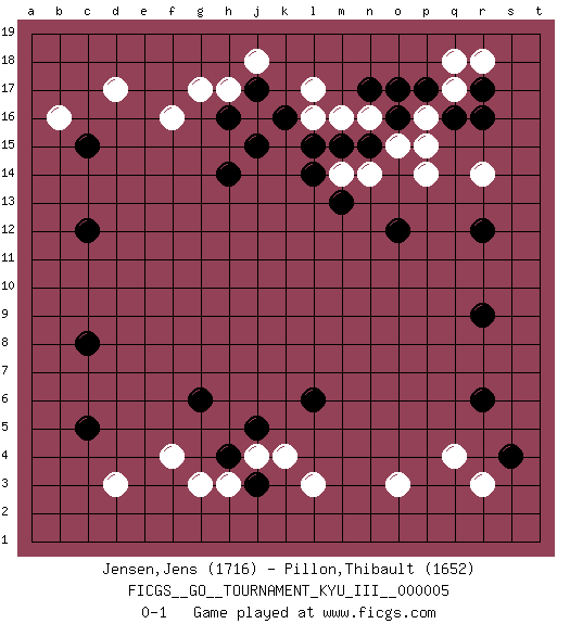 Last move : 0-1 2010 February 23 9:15:54 [Event "FICGS__GO__TOURNAMENT_KYU_III__000005 "] [Site "FICGS"] [Date "2009.11.22"] [Round "1"] [Black "Jensen,Jens "] [White "Pillon,Thibault "] [Result "0-1"] [Rating 1 "1716"] [Rating 2 "1652"] 1.r16 d17 2.c5 q4 3.c15 f16 4.c12 l17 5.p17 d3 6.c8 f4 7.h16 b16 8.h14 h17 9.j17 j16 10.j15 g17 11.k16 j18 12.h4 h3 13.j3 g3 14.r6 o3 15.s4 r3 16.r9 l3 17.g6 j4 18.j5 k4 19.l6 r14 20.r12 p14 21.o12 n14 22.m13 m14 23.n17 l16 24.l15 m16 25.m15 n16 26.n15 o15 27.l14 p16 28.o17 q17 29.r17 q18 30.q16 r18 31.o16 p15 0-1 This go game has been lost on time (started : 2009.11.22 2:6:35) Here are the names of the openings (joseki) played in the four corners : Corner d16 : d17 c15Komoku (Somok, Xiao~mu`) 3-4 Point. The komoku (3-4) point is the traditional corner enclosure move..Ikken Kakari (Hankan Keolch'im, Yi Gua`jiao~, 1-Space Low Pincer). The small knight move is the basic approach move to the 3-4 point stone. It has been continually used for over four centuries. There are limitless variations, with new moves constantly being discovered. Black 2 opens the door to a treaure store of joseki. Corner q16 : r16 l17Komoku (Somok, Xiao~mu`) 3-4 Point. The komoku (3-4) point is the traditional corner enclosure move.. Corner d4 : c5 d3Mokuhazushi (Waemok, Wai`mu`) 5-3 Point. The mokuhazushi (5-3) point was popular in the Edo period in Japan (1600 - 1867). It emphasizes influence; territorially, it is inferior to the 3-4 point.Komoku Kakari. White 2 is the standard approach because of its solidity and stability. Corner q4 : q4 r6Hoshi (Hwajeom, Seongjeom, Xingwei`) 4-4 Point. The star or hoshi (4-4) point, emphasizing influence at the potential expense of territory.Ikken Kakari (Hankan Keolch'im, Yi Gua`jiao~, 1-Space Low Approach). Black 2 is the standard approach move to the 4-4. Player White won this Go (weiqi, baduk) game.Follow this game move after move (download ) Don't make compact groups of stones. (Anonymous) All war is based on deception. (Sun Tzu)