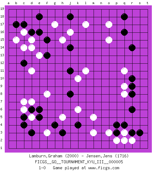Last move : 1-0 2010 February 25 21:21:30 [Event "FICGS__GO__TOURNAMENT_KYU_III__000005 "] [Site "FICGS"] [Date "2009.11.22"] [Round "1"] [Black "Lamburn,Graham "] [White "Jensen,Jens "] [Result "1-0"] [Rating 1 "2000"] [Rating 2 "1716"] 1.q16 d5 2.q4 c16 3.e16 g17 4.e18 d14 5.f15 j16 6.c12 e13 7.c15 d15 8.d16 b15 9.c17 c14 10.b17 d11 11.k4 o3 12.r6 q3 13.r3 r2 14.p3 q2 15.p4 p2 16.s3 m3 17.d3 f3 18.c5 c6 19.c4 q11 20.d6 c7 21.e5 d7 22.e6 o17 23.r14 o15 24.q18 f8 25.h3 m5 26.r9 q9 27.r10 q8 28.r8 k6 29.j18 h5 30.g4 l17 31.j14 h15 32.j11 l11 33.j8 k10 34.f13 1-0 This go game has been lost on time (started : 2009.11.22 2:6:35) Here are the names of the openings (joseki) played in the four corners : Corner d16 : c16 e16Komoku (Somok, Xiao~mu`) 3-4 Point. The komoku (3-4) point is the traditional corner enclosure move..Ikken Takagakari (Hankan Nop'dakeolch'im, Yi Gaogua`jiao~, 1-Space High Approach). The 5-4 approach move has become more popular in modern times, as modern Go emphasizes speed and influence. Corner q4 : q4 o3Hoshi (Hwajeom, Seongjeom, Xingwei`) 4-4 Point. The star or hoshi (4-4) point, emphasizing influence at the potential expense of territory.Ikken Kakari (Hankan Keolch'im, Yi Gua`jiao~, 1-Space Low Approach). White 2 is the standard approach move to the 4-4. Corner d4 : d5 d3Takamoku (Gomok, Gaomu`) 5-4 Point. The takamoku (high) point (5-4). With its emphasis on influence, the 5-4 point complements the 4-4 (hoshi) point in creating an influence-oriented fuseki.Komoku. White responds with 3-3, 3-5, 4-6, 4-7, 3-6, 3-7. Corner q16 : q16 q11Hoshi (Hwajeom, Seongjeom, Xingwei`) 4-4 Point. The star or hoshi (4-4) point, emphasizing influence at the potential expense of territory. Player Black won this Go (weiqi, baduk) game.Follow this game move after move (download ) The simplest move is the best move. (Anonymous) I have opinions of my own - strong opinions - but I don't always agree with them. (George Bush)