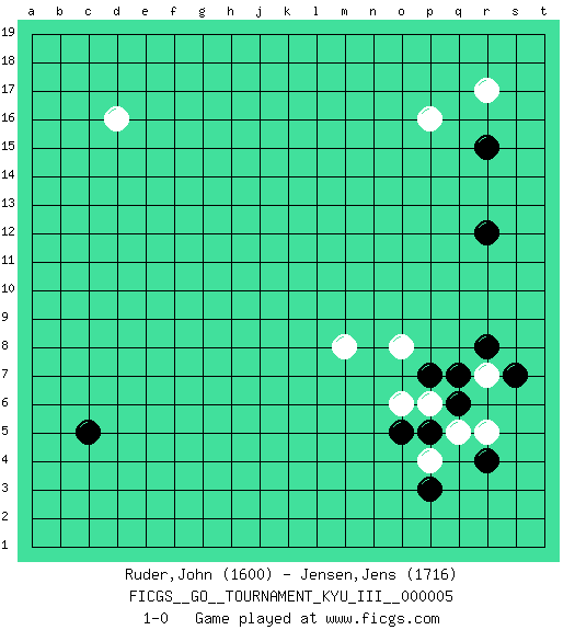 Last move : 1-0 2010 February 23 9:15:54 [Event "FICGS__GO__TOURNAMENT_KYU_III__000005"] [Site "FICGS"] [Date "2009.11.22"] [Round "1"] [Black "Ruder,John"] [White "Jensen,Jens"] [Result "1-0"] [Rating 1 "1600"] [Rating 2 "1716"] 1.p3 d16 2.c5 p16 3.r15 r17 4.r12 q5 5.q7 o6 6.r4 r5 7.s7 r7 8.r8 o8 9.p7 m8 10.p5 p6 11.q6 p4 12.o5 1-0 This go game has been lost on time (started : 2009.11.22 2:6:35) Here are the names of the openings (joseki) played in the four corners : Corner q16 : p16 r15 Takamoku (Gomok, Gaomu`) 5-4 Point. The takamoku (high) point (5-4). With its emphasis on influence, the 5-4 point complements the 4-4 (hoshi) point in creating an influence-oriented fuseki. Corner q4 : p3 q5 Mokuhazushi (Waemok, Wai`mu`) 5-3 Point. The mokuhazushi (5-3) point was popular in the Edo period in Japan (1600 - 1867). It emphasizes influence; territorially, it is inferior to the 3-4 point. Takamoku Kakari. White prevents Black from gaining influence, but in the local context, abandoning profit in the corner entails a loss. Black 3-4 and 4-4 are best. Player Black won this Go (weiqi, baduk) game. Follow this game move after move (download)If you have won four corners, resign. (Anonymous) Life is like a ten-speed bicycle: most of us have gears we never use. (Charles M. Schulz)