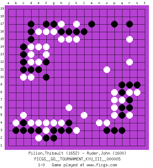 Last move : 1-0 2010 February 6 20:24:26 [Event "FICGS__GO__TOURNAMENT_KYU_III__000005"] [Site "FICGS"] [Date "2009.11.22"] [Round "1"] [Black "Pillon,Thibault"] [White "Ruder,John"] [Result "1-0"] [Rating 1 "1652"] [Rating 2 "1600"] 1.p17 r5 2.d15 c5 3.d3 e4 4.e3 f4 5.g3 g4 6.h3 h4 7.j4 f3 8.f2 e2 9.g2 k3 10.j3 l5 11.q3 o4 12.p3 r15 13.r17 r12 14.d17 k17 15.m17 f16 16.c12 d10 17.c4 b4 18.b3 d4 19.c3 j6 20.h16 h17 21.g17 g16 22.f17 e16 23.d16 h15 24.j16 j15 25.k16 k15 26.l16 f14 27.o3 n4 28.r7 q7 29.q8 r8 30.q6 p7 31.r6 p5 32.q5 p6 33.r9 s8 34.s9 p8 35.q9 o11 36.f12 e12 37.e13 f13 38.e11 d12 39.d11 d13 40.c13 d14 41.c14 e14 42.f10 c10 43.c11 1-0 This go game has been lost on time (started : 2009.11.22 2:6:35) Here are the names of the openings (joseki) played in the four corners : Corner d4 : c5 d3 Mokuhazushi (Waemok, Wai`mu`) 5-3 Point. The mokuhazushi (5-3) point was popular in the Edo period in Japan (1600 - 1867). It emphasizes influence; territorially, it is inferior to the 3-4 point. Komoku Kakari. Black 2 is the standard approach because of its solidity and stability. Corner q16 : p17 r15 Mokuhazushi (Waemok, Wai`mu`) 5-3 Point. The mokuhazushi (5-3) point was popular in the Edo period in Japan (1600 - 1867). It emphasizes influence; territorially, it is inferior to the 3-4 point. Player Black won this Go (weiqi, baduk) game. Follow this game move after move (download)Learning josekis by heart is useless if you don't try departing from them. (Pierre Audouard) Men should grow up. - Yeah. And dogs should stop licking themselves. It's not gonna happen. (Gregory House to Dr. Cameron, House M.D.)