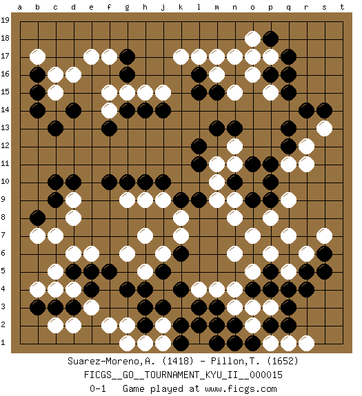 Last move : 0-1 2009 December 27 21:25:26 [Event "FICGS__GO__TOURNAMENT_KYU_II__000015"] [Site "FICGS"] [Date "2009.11.24"] [Round "1"] [Black "Suarez-Moreno,Alejandro"] [White "Pillon,Thibault"] [Result "0-1"] [Rating 1 "1418"] [Rating 2 "1652"] 1.q17 d4 2.q3 q5 3.r5 r6 4.r4 q7 5.o4 r11 6.k4 d16 7.r14 k17 8.c10 c7 9.c13 c15 10.g4 n17 11.q12 r12 12.q13 m4 13.m3 l4 14.l3 e3 15.g16 f17 16.g17 e17 17.g14 d9 18.c9 d8 19.b8 b7 20.d10 n4 21.p5 p6 22.l16 l17 23.n16 m16 24.m15 m17 25.l15 o16 26.p16 n15 27.m13 p15 28.q15 p17 29.q16 o5 30.p4 n6 31.k6 g2 32.h3 g6 33.f10 g9 34.g10 h9 35.h10 j9 36.j10 n3 37.k9 k8 38.l9 k7 39.h2 f2 40.h6 h5 41.j5 h7 42.h4 j6 43.n2 o2 44.l2 n1 45.m2 o3 46.d14 j2 47.k2 h1 48.j3 j1 49.k1 g1 50.m1 q11 51.f5 e6 52.e5 d6 53.d5 c5 54.b16 c16 55.b15 b17 56.b14 j15 57.j14 r1 58.p2 p1 59.q2 q1 60.o1 p3 61.q4 n1 62.o6 o7 63.o1 h15 64.n1 g15 65.h14 f15 66.p18 o17 67.s6 s7 68.s5 n11 69.o11 o10 70.n10 n9 71.p10 m10 72.p11 q9 73.p9 p8 74.o9 n8 75.n10 m9 76.l11 n12 77.n13 m11 78.l12 s13 79.s14 f14 80.f13 o18 81.c3 c4 82.b3 b4 83.d3 d2 84.e4 c2 0-1 Here are the names of the openings (joseki) played in the four corners : Corner q4 : q3 q5 Komoku (Somok, Xiao~mu`) 3-4 Point. The komoku (3-4) point is the traditional corner enclosure move.. Ikken Takagakari (Hankan Nop'dakeolch'im, Yi Gaogua`jiao~, 1-Space High Approach). The 5-4 approach move has become more popular in modern times, as modern Go emphasizes speed and influence. Corner q16 : q17 r11 Komoku (Somok, Xiao~mu`) 3-4 Point. The komoku (3-4) point is the traditional corner enclosure move.. Corner d16 : d16 c13 Hoshi (Hwajeom, Seongjeom, Xingwei`) 4-4 Point. The star or hoshi (4-4) point, emphasizing influence at the potential expense of territory. Nikken Kakari (Dukan Keolch'im, E`r Gua`jiao~, 2-Space Low Approach). White typically answers by 7-3 or 3-5 (which is not joseki). Player White won this Go (weiqi, baduk) game. Follow this game move after move (download)If a formation is symmetrical, play at the center. (Anonymous) Methinks King Thibault should dub Marius Zubac a knight of the square board... I mean table, henceforth addressing him as Sir Marius, and bestow on him a suitable land from the kingdom of FICGS & marry him off to a worthy, fair maiden, lest he slice our heads with his mighty sword in his wrath. (Dinesh De Silva)