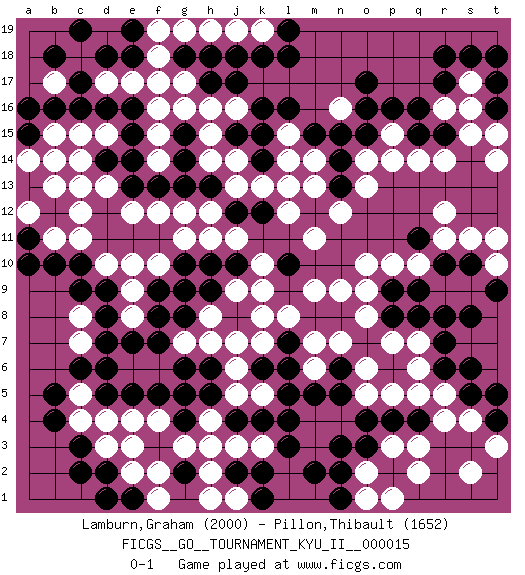 Last move : 0-1 2010 January 2 14:7:7 [Event "FICGS__GO__TOURNAMENT_KYU_II__000015"] [Site "FICGS"] [Date "2009.11.24"] [Round "1"] [Black "Lamburn,Graham"] [White "Pillon,Thibault"] [Result "0-1"] [Rating 1 "2000"] [Rating 2 "1652"] 1.q16 d4 2.d16 r4 3.p4 p3 4.o3 q3 5.f3 j3 6.d6 f4 7.g4 e3 8.f5 e4 9.g5 m3 10.n3 m4 11.n5 r14 12.o17 q10 13.k4 k3 14.m5 l4 15.l5 g3 16.h3 f2 17.g2 h2 18.f3 n4 19.o4 g3 20.m2 h4 21.l3 c14 22.d11 f17 23.d14 d13 24.e14 c15 25.c16 c11 26.c10 b11 27.e13 c8 28.h17 f15 29.e16 f16 30.d12 c13 31.b10 d10 32.d9 e10 33.c9 e12 34.e11 e9 35.d8 f12 36.g14 c18 37.f11 g12 38.g13 g9 39.d18 g11 40.b5 h16 41.j17 j16 42.k16 j14 43.k15 h14 44.g15 g16 45.h13 j13 46.j12 h12 47.e18 f18 48.k12 l14 49.m15 l13 50.j10 b17 51.b16 b15 52.a16 l12 53.l10 o13 54.c3 c7 55.d7 q6 56.r10 r11 57.q11 r12 58.q9 p10 59.r8 n16 60.n14 o14 61.o15 p15 62.o16 c5 63.c6 c4 64.b4 o6 65.r6 q5 66.s5 s4 67.t4 t3 68.t5 s2 69.s10 s16 70.n13 n12 71.m12 m13 72.n15 m11 73.r17 s17 74.s18 s11 75.p9 o10 76.t17 r16 77.r18 k8 78.j8 k7 79.j7 j9 80.h9 k9 81.h10 h8 82.g8 h7 83.g10 f10 84.f9 e8 85.e7 c12 86.f8 j6 87.h5 k10 88.c17 j11 89.q15 q14 90.n8 n9 91.m8 m9 92.d2 e2 93.f7 l15 94.l16 q7 95.r7 t10 96.t9 t11 97.s8 j19 98.k18 k19 99.l19 g19 100.l18 o2 101.n2 p1 102.k2 o8 103.q8 m7 104.l7 n7 105.l6 l8 106.r15 s15 107.p16 p14 108.t16 t14 109.j18 h19 110.k14 k13 111.a15 a14 112.a13 b14 113.a11 a12 114.b12 b13 115.a10 a12 116.j2 d3 117.c2 r5 118.s6 j1 119.j4 h3 120.k1 h1 121.b18 p5 122.n1 o1 123.q4 q2 124.p8 p7 125.e1 f1 126.d1 e17 127.h6 j5 128.e5 k5 129.l4 g7 130.k6 j7 131.g6 d17 132.e19 f19 133.c19 h11 134.g9 d15 135.e15 f14 136.f13 g17 137.h18 t15 138.t18 o5 139.j15 h15 140.d5 o9 141.n6 m6 142.g18 m14 143.pass pass 0-1 Here are the names of the openings (joseki) played in the four corners : Corner q4 : r4 p4 Komoku (Somok, Xiao~mu`) 3-4 Point. The komoku (3-4) point is the traditional corner enclosure move.. Ikken Takagakari (Hankan Nop'dakeolch'im, Yi Gaogua`jiao~, 1-Space High Approach). The 5-4 approach move has become more popular in modern times, as modern Go emphasizes speed and influence. Corner d4 : d4 f3 Hoshi (Hwajeom, Seongjeom, Xingwei`) 4-4 Point. The star or hoshi (4-4) point, emphasizing influence at the potential expense of territory. Ikken Kakari (Hankan Keolch'im, Yi Gua`jiao~, 1-Space Low Approach). Black 2 is the standard approach move to the 4-4. Corner q16 : q16 r14 Hoshi (Hwajeom, Seongjeom, Xingwei`) 4-4 Point. The star or hoshi (4-4) point, emphasizing influence at the potential expense of territory. Ikken Kakari (Hankan Keolch'im, Yi Gua`jiao~, 1-Space Low Approach). White 2 is the standard approach move to the 4-4. Corner d16 : d16 c14 Hoshi (Hwajeom, Seongjeom, Xingwei`) 4-4 Point. The star or hoshi (4-4) point, emphasizing influence at the potential expense of territory. Ikken Kakari (Hankan Keolch'im, Yi Gua`jiao~, 1-Space Low Approach). White 2 is the standard approach move to the 4-4. Player White won this Go (weiqi, baduk) game. Follow this game move after move (download)Nothing requires doing this or that, but necessity exists. (Pierre Audouard) A shortcut is the longest distance between two points. (Don Groves)