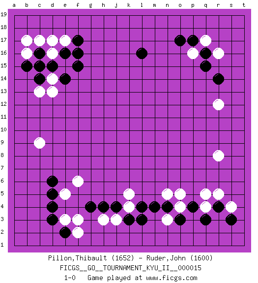 Last move : 1-0 2010 January 29 8:40:14 [Event "FICGS__GO__TOURNAMENT_KYU_II__000015 "] [Site "FICGS"] [Date "2009.11.24"] [Round "1"] [Black "Pillon,Thibault "] [White "Ruder,John "] [Result "1-0"] [Rating 1 "1652"] [Rating 2 "1600"] 1.q16 e17 2.q3 r5 3.d4 f3 4.d6 n3 5.p4 r8 6.r4 s4 7.s3 q5 8.c16 d14 9.e16 d16 10.d15 d17 11.c15 e15 12.f16 c17 13.c14 d13 14.f15 c13 15.e14 c9 16.e2 e3 17.d3 f2 18.f17 b16 19.b15 b17 20.r14 r12 21.k3 k4 22.j4 j3 23.l4 k5 24.l3 n5 25.n4 o4 26.m4 q4 27.o3 o5 28.h4 h3 29.g4 e5 30.d5 f6 31.l16 q17 32.p17 p16 33.o17 r16 34.q15 1-0 This go game has been lost on time (started : 2009.11.24 9:59:25) Here are the names of the openings (joseki) played in the four corners : Corner q4 : q3 r5Komoku (Somok, Xiao~mu`) 3-4 Point. The komoku (3-4) point is the traditional corner enclosure move..Ikken Kakari (Hankan Keolch'im, Yi Gua`jiao~, 1-Space Low Pincer). The small knight move is the basic approach move to the 3-4 point stone. It has been continually used for over four centuries. There are limitless variations, with new moves constantly being discovered. White 2 opens the door to a treaure store of joseki. Corner d4 : d4 f3Hoshi (Hwajeom, Seongjeom, Xingwei`) 4-4 Point. The star or hoshi (4-4) point, emphasizing influence at the potential expense of territory.Ikken Kakari (Hankan Keolch'im, Yi Gua`jiao~, 1-Space Low Approach). White 2 is the standard approach move to the 4-4. Corner d16 : e17 c16Mokuhazushi (Waemok, Wai`mu`) 5-3 Point. The mokuhazushi (5-3) point was popular in the Edo period in Japan (1600 - 1867). It emphasizes influence; territorially, it is inferior to the 3-4 point.Komoku Kakari. Black 2 is the standard approach because of its solidity and stability. Player Black won this Go (weiqi, baduk) game.Follow this game move after move (download ) Everything happens on a grid-engraved board with black and white pieces, but if that's all you see then you don't know Go. (Pierre Audouard) Difficult things take a long time, impossible things a little longer. (Author unknown)
