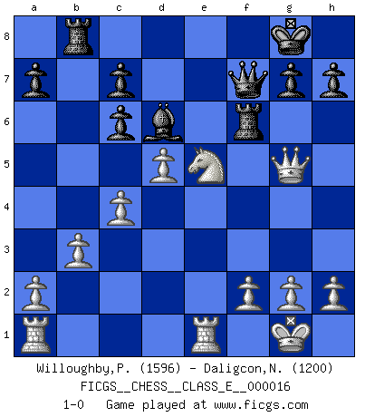 Last move : 1-0 2007 February 4 14:47:2 [Event "FICGS__CHESS__CLASS_E__000016"] [Site "FICGS"] [Date "2006.10.04"] [Round "1"] [White "Willoughby,Peter"] [Black "Daligcon,Nelson"] [Result "1-0"] [WhiteElo "1596"] [BlackElo "1200"] 1.e4 e5 2.Nf3 f5 3.exf5 Nc6 4.Bc4 d5 5.Bb5 Bd6 6.O-O Bxf5 7.Bxc6+ bxc6 8.d3 Ne7 9.Bg5 O-O 10.Bxe7 Qxe7 11.Nbd2 Rab8 12.b3 Bg4 13.Qc1 Qf6 14.c4 Qg6 15.Nh4 Qh6 16.Nhf3 e4 17.dxe4 Bxf3 18.Nxf3 Qh5 19.Qg5 Qe8 20.exd5 Rf6 21.Rfe1 Qf7 22.Ne5 1-0 Latvian counter-gambit Kingside Castling by player White (move 6) Kingside Castling by player Black (move 9) Player White won this chess game. Follow this game move after move (download)Excellence at Chess is one mark of a scheming mind. (Sir Arthur Conan Doyle) Ich würde mich als ganz normalen Jungen bezeichnen [Im Alter von 12]. (Sergej Karjakin) Para mi, el Ajedrez es la vida y cada partida es como una nueva vida. Todo jugador de Ajedrez suele vivir muchas vidas durante su vida. (Eduard Gufeld) Avec des compensations pour le matériel en plus... (Anonyme) Men never do evil so completely and cheerfully as when they do it from religious conviction. (Blaise Pascal)
