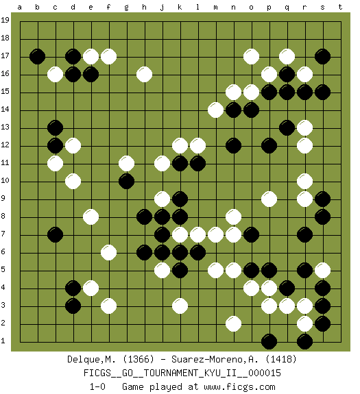 Last move : 1-0 2010 March 23 9:25:5 [Event "FICGS__GO__TOURNAMENT_KYU_II__000015"] [Site "FICGS"] [Date "2009.11.24"] [Round "1"] [Black "Delque,Michael"] [White "Suarez-Moreno,Alejandro"] [Result "1-0"] [Rating 1 "1366"] [Rating 2 "1418"] 1.d4 c16 2.q4 q17 3.r15 r13 4.p15 r16 5.s15 r10 6.s17 o17 7.q16 p16 8.q15 o15 9.q13 r12 10.p12 k3 11.d17 f17 12.e16 e17 13.d16 h16 14.b17 d10 15.c12 d12 16.c13 c11 17.r7 s5 18.r5 r3 19.s4 q3 20.s3 p3 21.s2 f3 22.d3 e4 23.c7 p4 24.p5 n5 25.o5 o4 26.o7 n7 27.k8 n8 28.k6 k7 29.j7 l7 30.h6 f6 31.l6 m7 32.h8 j9 33.j8 j11 34.g10 e8 35.k9 g11 36.k11 k12 37.l11 l12 38.o14 n15 39.n14 m14 40.n12 p9 41.s9 r9 42.s8 j5 43.j6 m5 44.p1 r2 45.r1 n2 46.k5 1-0 This go game has been lost on time (started : 2009.11.24 9:59:25) Here are the names of the openings (joseki) played in the four corners : Corner q16 : q17 r15 Komoku (Somok, Xiao~mu`) 3-4 Point. The komoku (3-4) point is the traditional corner enclosure move.. Ikken Kakari (Hankan Keolch'im, Yi Gua`jiao~, 1-Space Low Pincer). The small knight move is the basic approach move to the 3-4 point stone. It has been continually used for over four centuries. There are limitless variations, with new moves constantly being discovered. Black 2 opens the door to a treaure store of joseki. Corner d16 : c16 d17 Komoku (Somok, Xiao~mu`) 3-4 Point. The komoku (3-4) point is the traditional corner enclosure move.. Corner d4 : d4 f3 Hoshi (Hwajeom, Seongjeom, Xingwei`) 4-4 Point. The star or hoshi (4-4) point, emphasizing influence at the potential expense of territory. Ikken Kakari (Hankan Keolch'im, Yi Gua`jiao~, 1-Space Low Approach). White 2 is the standard approach move to the 4-4. Player Black won this Go (weiqi, baduk) game. Follow this game move after move (download)Add one stone, then sacrifice both. (Anonymous) Bobby never cared about money, though. His only desire was to prove that his choices were correct: He wanted chess to be important because he was a chess player, and he wanted to be important. Bobby knew money was important, but he didn't have a clue why, outside of clothes and status. The only way he could accomplish what he wanted was to fight for a lot of money. Once he got it, he gave it away. He did not know how to spend it. And once he'd become champion, after, essentially, sacrificing his life for it, he didn't know how to spend his time. (Bob Wade)