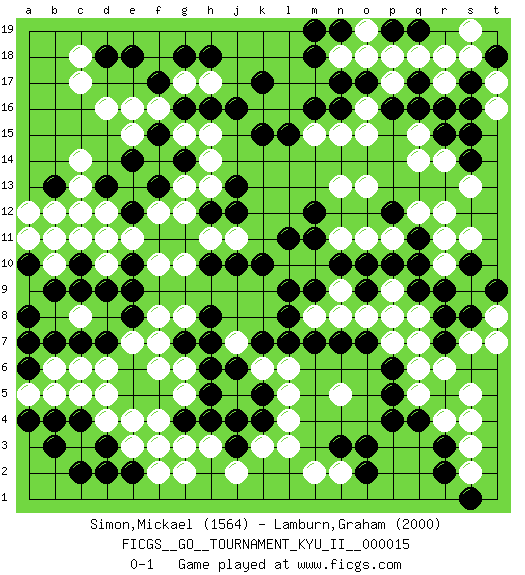 Last move : 0-1 2010 February 26 0:5:18 [Event "FICGS__GO__TOURNAMENT_KYU_II__000015"] [Site "FICGS"] [Date "2009.11.24"] [Round "1"] [Black "Simon,Mickael"] [White "Lamburn,Graham"] [Result "0-1"] [Rating 1 "1564"] [Rating 2 "2000"] 1.q16 d16 2.q4 d4 3.f17 c14 4.d18 h17 5.f15 c17 6.k17 h15 7.k15 h13 8.h18 f16 9.g16 g17 10.g18 e16 11.h16 g15 12.j16 d10 13.f3 c6 14.d2 c3 15.c2 h3 16.f5 l3 17.o3 r14 18.r15 q14 19.o17 r10 20.h5 l5 21.r8 s4 22.r3 q5 23.r5 r4 24.p4 s3 25.r2 r6 26.p5 q6 27.p6 q8 28.q9 p7 29.r9 p9 30.q10 r11 31.q11 q12 32.p12 r12 33.o7 o8 34.n7 n8 35.m7 m8 36.l7 p11 37.p10 o11 38.o10 n11 39.n10 m10 40.m11 o13 41.m12 n13 42.m9 l10 43.l9 n9 44.l8 q7 45.k10 s2 46.l11 s7 47.f13 f14 48.e14 e15 49.c12 d12 50.c10 c11 51.b11 d11 52.c9 b12 53.b13 a12 54.d9 e7 55.e9 g8 56.f11 g10 57.g11 f10 58.e10 e11 59.d13 c13 60.e12 c12 61.h10 f8 62.d7 d6 63.c7 b6 64.e6 h11 65.h12 j11 66.j12 g12 67.j10 f12 68.j13 n2 69.o2 f2 70.e2 g2 71.n3 m2 72.k4 l4 73.j3 j2 74.h4 e3 75.b3 f4 76.d3 e4 77.c4 c5 78.e8 f7 79.k5 k6 80.j6 j7 81.k7 l6 82.h7 g6 83.h6 r17 84.s15 p18 85.q17 q18 86.s17 o18 87.n17 s18 88.r16 r18 89.t18 n18 90.m18 p17 91.p16 o16 92.n16 s19 93.n19 o19 94.q19 o15 95.s14 s13 96.m19 t16 97.s16 t17 98.b7 a9 99.a7 b10 100.b9 a11 101.a8 c8 102.a6 a5 103.a4 b5 104.b4 d5 105.e5 g3 106.g4 f3 107.a10 b11 108.g7 k3 109.j4 f6 110.h8 c18 111.e18 n15 112.m16 m15 113.l15 g5 114.g14 g13 115.f15 h14 116.s10 s11 117.r7 s5 118.o9 p8 119.s8 t8 120.t9 t7 121.s1 n5 122.p19 q15 0-1 Here are the names of the openings (joseki) played in the four corners : Corner d16 : d16 f17 Hoshi (Hwajeom, Seongjeom, Xingwei`) 4-4 Point. The star or hoshi (4-4) point, emphasizing influence at the potential expense of territory. Ikken Kakari (Hankan Keolch'im, Yi Gua`jiao~, 1-Space Low Approach). Black 2 is the standard approach move to the 4-4. Corner d4 : d4 f3 Hoshi (Hwajeom, Seongjeom, Xingwei`) 4-4 Point. The star or hoshi (4-4) point, emphasizing influence at the potential expense of territory. Ikken Kakari (Hankan Keolch'im, Yi Gua`jiao~, 1-Space Low Approach). Black 2 is the standard approach move to the 4-4. Corner q4 : q4 l3 Hoshi (Hwajeom, Seongjeom, Xingwei`) 4-4 Point. The star or hoshi (4-4) point, emphasizing influence at the potential expense of territory. Corner q16 : q16 r14 Hoshi (Hwajeom, Seongjeom, Xingwei`) 4-4 Point. The star or hoshi (4-4) point, emphasizing influence at the potential expense of territory. Ikken Kakari (Hankan Keolch'im, Yi Gua`jiao~, 1-Space Low Approach). White 2 is the standard approach move to the 4-4. Player White won this Go (weiqi, baduk) game. Follow this game move after move (download)Go is to western chess what philosophy is to double entry accounting. (from Shibumi, by Trevanian) That's absurd. I love it. (Gregory House, House M.D.)