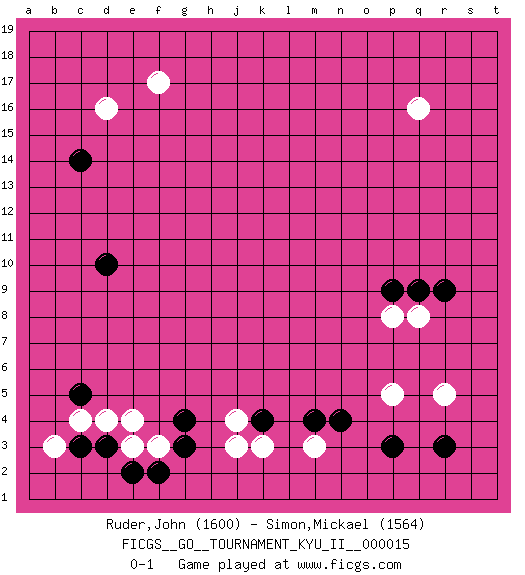 Last move : 0-1 2010 January 22 20:22:33 [Event "FICGS__GO__TOURNAMENT_KYU_II__000015 "] [Site "FICGS"] [Date "2009.11.24"] [Round "1"] [Black "Ruder,John "] [White "Simon,Mickael "] [Result "0-1"] [Rating 1 "1600"] [Rating 2 "1564"] 1.p3 d16 2.c5 q16 3.c14 f17 4.d10 r5 5.r9 p5 6.r3 q8 7.q9 p8 8.p9 m3 9.n4 d4 10.c3 c4 11.d3 e3 12.e2 f3 13.f2 b3 14.g3 e4 15.g4 j3 16.k4 k3 17.m4 j4 0-1 This go game has been lost on time (started : 2009.11.24 9:59:25) Here are the names of the openings (joseki) played in the four corners : Corner d16 : d16 c14Hoshi (Hwajeom, Seongjeom, Xingwei`) 4-4 Point. The star or hoshi (4-4) point, emphasizing influence at the potential expense of territory.Ikken Kakari (Hankan Keolch'im, Yi Gua`jiao~, 1-Space Low Approach). Black 2 is the standard approach move to the 4-4. Corner q4 : p3 r5Mokuhazushi (Waemok, Wai`mu`) 5-3 Point. The mokuhazushi (5-3) point was popular in the Edo period in Japan (1600 - 1867). It emphasizes influence; territorially, it is inferior to the 3-4 point. Corner d4 : c5 d4Mokuhazushi (Waemok, Wai`mu`) 5-3 Point. The mokuhazushi (5-3) point was popular in the Edo period in Japan (1600 - 1867). It emphasizes influence; territorially, it is inferior to the 3-4 point. Player White won this Go (weiqi, baduk) game.Follow this game move after move (download ) Eyes win semiais. (Anonymous) Big Chess is a place for big hallucinations. (Thibault de Vassal)