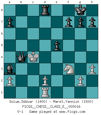 Last move : 0-1 2006 November 13 13:52:29 [Event "FICGS__CHESS__CLASS_E__000016"] [Site "FICGS"] [Date "2006.10.04"] [Round "1"] [White "Solum,Oddvar"] [Black "Maret,Yannick"] [Result "0-1"] [WhiteElo "1400"] [BlackElo "1500"] 1.e4 Nf6 2.Nc3 d5 3.h3 d4 4.Nb5 e5 5.Nf3 Bd6 6.c3 c5 7.b4 b6 8.Ba3 Qe7 9.Qa4 O-O 10.Bc4 Nxe4 11.O-O-O Nxf2 12.Rhf1 Nxd1 13.Rxd1 Bd7 14.Bd5 Bc6 15.Bxc6 Nxc6 16.bxc5 bxc5 17.cxd4 Nxd4 18.Ng1 Nxb5 19.Qxb5 c4 20.Kb2 Bxa3+ 21.Kc2 Rab8 22.Qxc4 Rfc8 23.Kc3 Rxc4+ 24.Kxc4 Rd8 25.Nf3 Qb4+ 0-1 Comment by player 1 : Oddvar Solum : Thanx for the game ! Comment by player 2 : Yannick Maret : You're welcome but note that you've still to resign the game... Alekhine's defense : Scandinavian variation Kingside Castling by player Black (move 9) Queenside Castling by player White (move 11) Player Black won this chess game. Follow this game move after move (download)When you see a good move, look for a better one. (Emanuel Lasker) Der Freibauer hat für mich eine Seele, genau wie der Mensch, Wünsche, die unerkannt in ihm schlummern, und Befürchtungen, von deren Existenz er selbst kaum ahnt. (Aaron Nimzowitsch) Hay dos clases de hombres: aquellos que se conforman en dejarse llevar por las circunstancias y que juegan barajas y aquellos decididos a controlar las circunstancias y que juegan al Ajedrez. (Mortimer Collins) Roi des jeux et jeu des rois, les échecs portent en eux un sentiment d'infini. Ils donnent à celui qui s'est efforcé d'en approfondir les arcanes l'impression de n'être pas à la mesure de l'homme; en fait, ils constituent un résumé de l'univers, un microcosme, et figurent cette grande échelle qui, dans les plans de la lumière descend jusqu'à la matière, qui des abîmes insondables remonte jusqu'en l'infini de Dieu. (Pyrame) You must have a dream in order to have it come true. (A.P.J. Kalam)