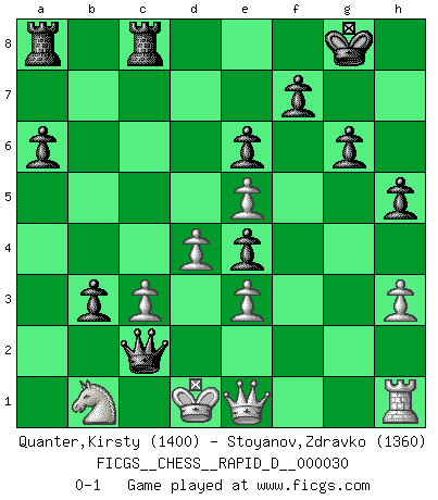 Last move : 0-1 2009 December 8 20:41:25 [Event "FICGS__CHESS__RAPID_D__000030"] [Site "FICGS"] [Date "2009.11.24"] [Round "1"] [White "Quanter,Kirsty"] [Black "Stoyanov,Zdravko"] [Result "0-1"] [WhiteElo "1400"] [BlackElo "1360"] 1.Nf3 d5 2.g3 e6 3.Bh3 Nc6 4.d4 h6 5.c3 Bd6 6.b4 a6 7.a4 Bd7 8.a5 b6 9.axb6 cxb6 10.Bf4 Bxf4 11.gxf4 Nf6 12.Ne5 Nh5 13.b5 Nxe5 14.fxe5 Bxb5 15.Bg4 Nf4 16.e3 Nd3+ 17.Kd2 Nxf2 18.Qg1 Nxh1 19.Qxh1 O-O 20.Ke1 Qg5 21.Qf3 Bd3 22.Kd2 Be4 23.Qe2 b5 24.Na3 Rfc8 25.Rc1 g6 26.h3 h5 27.Bf3 Qg3 28.Bxe4 dxe4 29.Rh1 Qf3 30.Qe1 Qg2+ 31.Kc1 b4 32.Nb1 b3 33.Kd1 Qc2+ 0-1 Reti : King's Indian attack (Barcza system) Kingside Castling by player Black (move 19) Player Black won this chess game. Follow this game move after move (download)The hardest game to win is a won game. (Emanuel Lasker) In Buenos Aires ist es nicht mein vorrangiges Ziel ein starkes Turnier zu organisieren, sondern ein Turnier für Gentlemen. Ich würde nie Kamsky einladen. Ich mag keine Probleme. (Miguel Najdorf) Cada Peón es potencialmente una Reina. (James Mason) Comme les marins qui ont mille raisons différentes d'aller en mer, les joueurs d'échecs en ont tout autant avant de s'installer devant une table et jouer... (Vincent Bertignac, philosophe) Wisdom is the reward you get for a lifetime of listening when you'd have preferred to talk. (Doug Larson)