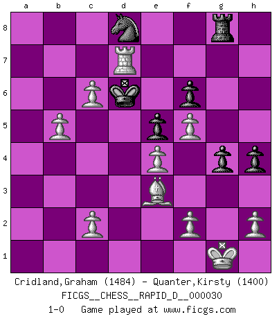 Last move : 1-0 2009 December 13 21:59:19 [Event "FICGS__CHESS__RAPID_D__000030"] [Site "FICGS"] [Date "2009.11.24"] [Round "1"] [White "Cridland,Graham"] [Black "Quanter,Kirsty"] [Result "1-0"] [WhiteElo "1484"] [BlackElo "1400"] 1.e4 e5 2.Nf3 Nc6 3.Bb5 Nd4 4.Ba4 c6 5.O-O b5 6.Bb3 Nxb3 7.axb3 f6 8.d4 Bb4 9.Nc3 d6 10.Be3 Bg4 11.d5 Bxc3 12.bxc3 cxd5 13.Qxd5 a6 14.Rxa6 Rxa6 15.Qxb5+ Qd7 16.Qxa6 Bxf3 17.gxf3 g5 18.Rd1 g4 19.f4 h5 20.Qxd6 Qxd6 21.Rxd6 Ke7 22.Ra6 h4 23.f5 Nh6 24.c4 Nf7 25.c5 Nd8 26.c6 Kd6 27.b4 Kc7 28.b5 Rg8 29.Ra7+ Kd6 30.Rd7+ 1-0 Ruy Lopez : Bird's defense Kingside Castling by player White (move 5) Player White won this chess game. Follow this game move after move (download)Chess is played with the mind and not with the hands ! (Renaud and Kahn) Es gibt nur zwei wahre Schachgenies - das andere war Wilhelm Steinitz, der Weltmeister von 1872 bis 1894. (Robert James Fischer) El ganar no lo es todo... pero el perder es nada. (Mednis) C'est une question de caractère, Beaucoup de gens perdent leur motivation très vite. D'autres, ils sont rares, peuvent la conserver très longtemps. J'aime les échecs, encore aujourd'hui je suis heureux d'analyser des parties. J'aime toujours gagner, je déteste encore perdre. Bien jouer est important pour mon intégrité intellectuelle et morale. Et puis les échecs vivent en ce moment une période historique grâce à Internet. Ils se développent dans les systèmes éducatifs à travers le monde. Ils sortent de leur ghetto, et c'est mon rôle de mener à bien cette révolution. (Gary Kasparov) The human is the only animal species whose members are able to talk themselves into difficulties that would not otherwise exist. (Wendell Johnson)