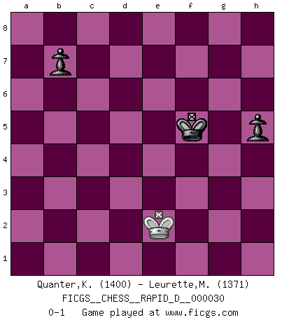 Last move : 0-1 2009 December 16 15:12:32 [Event "FICGS__CHESS__RAPID_D__000030"] [Site "FICGS"] [Date "2009.11.24"] [Round "1"] [White "Quanter,Kirsty"] [Black "Leurette,Marc-Antoine"] [Result "0-1"] [WhiteElo "1400"] [BlackElo "1371"] 1.e4 e5 2.Nc3 Nf6 3.Nf3 Nc6 4.Bb5 Bb4 5.Bxc6 dxc6 6.a3 Bxc3 7.dxc3 Qxd1+ 8.Kxd1 O-O 9.Bg5 Nxe4 10.Be7 Re8 11.Bh4 f6 12.Ke2 Bg4 13.h3 Be6 14.Rhd1 g5 15.Bg3 g4 16.hxg4 Bxg4 17.c4 Nxg3+ 18.fxg3 e4 19.Kf2 exf3 20.gxf3 Be6 21.c5 Kf7 22.g4 Rad8 23.b4 Rxd1 24.Rxd1 Bc4 25.c3 Re7 26.Rd4 Be6 27.a4 h6 28.a5 f5 29.gxf5 Bxf5 30.c4 h5 31.Kg3 Ke6 32.b5 Ke5 33.Rh4 cxb5 34.cxb5 Rh7 35.b6 cxb6 36.cxb6 axb6 37.axb6 Rh6 38.Rc4 Rxb6 39.Rc7 Rb3 40.Re7+ Kf6 41.Re2 Rxf3+ 42.Kxf3 Bg4+ 43.Kf2 Bxe2 44.Kxe2 Kf5 0-1 Vienna : Falkbeer variation Kingside Castling by player Black (move 8) 10 pieces endgame at move 36 : White KRPP , Black KRBPPP WHITE : King + 1 Rook 2 Pawns BLACK : King + 1 Rook 1 Bishop 3 Pawns 9 pieces endgame at move 37 : White KRPP , Black KRBPP WHITE : King + 1 Rook 2 Pawns BLACK : King + 1 Rook 1 Bishop 2 Pawns 8 pieces endgame at move 38 : White KRP , Black KRBPP WHITE : King + 1 Rook 1 Pawn BLACK : King + 1 Rook 1 Bishop 2 Pawns 7 pieces endgame at move 41 : White KR , Black KRBPP WHITE : King + 1 Rook BLACK : King + 1 Rook 1 Bishop 2 Pawns 6 pieces endgame at move 42 : White KR , Black KBPP WHITE : King + 1 Rook BLACK : King + 1 Bishop 2 Pawns 5 pieces endgame at move 43 : White K , Black KBPP WHITE : King + BLACK : King + 1 Bishop 2 Pawns 4 pieces endgame at move 44 : White K , Black KPP WHITE : King + BLACK : King + 2 Pawns Player Black won this chess game. Follow this game move after move (download)The passed pawn is a criminal, who should be kept under lock and key. Mild measures, such as police surveillance, are not sufficient. (Nimzovitch) Smyslow ist ein Beweis dafür, dass ich noch zehn Jahre spielen kann! [der 75 jährige über den 85 jährigen] (Viktor Kortschnoi) El juego de Fischer siempre fue nítido, racional y brillante. Uno de los mejores por siempre. (Dave Regis) Si je n'étais pas joueur d'échecs, je serais le meilleur dans quelque chose d'autre. (Anatoli Karpov) May the force be with you. (Han Solo in Star Wars ep.4)
