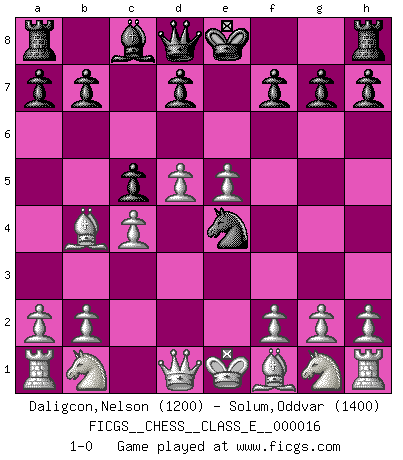 Last move : 1-0 2006 December 11 23:56:48 [Event "FICGS__CHESS__CLASS_E__000016"] [Site "FICGS"] [Date "2006.10.04"] [Round "1"] [White "Daligcon,Nelson"] [Black "Solum,Oddvar"] [Result "1-0"] [WhiteElo "1200"] [BlackElo "1400"] 1.d4 Nc6 2.c4 e5 3.d5 Nd4 4.e3 Bb4+ 5.Bd2 c5 6.exd4 Nf6 7.dxe5 Ne4 8.Bxb4 1-0 This chess game has been lost on time (started : 2006.10.04 9:7:59) Queen's pawn : Lundin (Kevitz-Mikenas) defense Player White won this chess game. Follow this game move after move (download)Suddenly it was obvious to me in my analysis I had missed what Fischer had found with the greatest of ease at the board. (Mikhail Botvinnik) Die unerbitterlichsten Regeln im Schach sind die Ausnahmen. (Savielly Grigorievitsch Tartakower) La maestría del Ajedrez consiste esencialmente en analizar posiciónes de Ajedrez con precisión. (Mikhail Botvinnik) Tout change constamment, y compris dans le monde des Echecs. (Botvinnik) The general who wins the battle makes many calculations in his temple before the battle is fought. The general who loses makes but few calculations beforehand. (Sun Tzu)