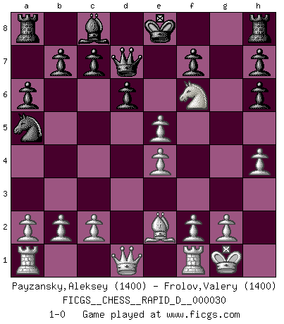 Last move : 1-0 2009 December 8 12:30:2 [Event "FICGS__CHESS__RAPID_D__000030"] [Site "FICGS"] [Date "2009.11.24"] [Round "1"] [White "Payzansky,Aleksey"] [Black "Frolov,Valery"] [Result "1-0"] [WhiteElo "1400"] [BlackElo "1400"] 1.e4 e5 2.Nf3 Nc6 3.Bb5 Na5 4.Nc3 a6 5.Be2 Nh6 6.Nxe5 Bc5 7.d4 Bd6 8.O-O Bxe5 9.dxe5 Qe7 10.Nd5 Qd8 11.h4 d6 12.Bg5 Qd7 13.Bxh6 gxh6 14.Nf6+ 1-0 Ruy Lopez : Pollock defense Kingside Castling by player White (move 8) Player White won this chess game. Follow this game move after move (download)A passed Pawn increases in strength as the number of pieces on the board diminishes. (Capablanca) Herr Iljumschinow ist ein etwas merkwürdiger Geschäftsmann: Er arbeitet zusammen mit Leuten wie Muammar al-Gaddafi; früher ist das Saddam Hussein gewesen. (Joel Lautier) El Ajedrez por encima de todo... ¡es una pelea!. (Emanuel Lasker) Aidez vos pièces, elles vous aideront. (Paul Morphy) Convictions are more dangerous enemies of truth than lies. (Friedrich Nietzsche)
