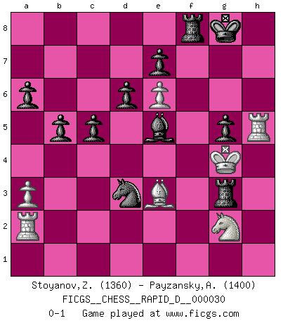 Last move : 0-1 2009 November 29 14:51:10 [Event "FICGS__CHESS__RAPID_D__000030"] [Site "FICGS"] [Date "2009.11.24"] [Round "1"] [White "Stoyanov,Zdravko"] [Black "Payzansky,Aleksey"] [Result "0-1"] [WhiteElo "1360"] [BlackElo "1400"] 1.e4 c5 2.Nf3 d6 3.h3 Nc6 4.Bb5 Bd7 5.c3 Nf6 6.d3 g6 7.Bg5 Bg7 8.O-O O-O 9.Re1 Qb6 10.Na3 a6 11.Nc4 Qc7 12.Bxc6 Bxc6 13.e5 Nd5 14.e6 f5 15.a3 h6 16.Bd2 b5 17.Ne3 Nf4 18.d4 Nd3 19.Re2 Bxf3 20.gxf3 Qb7 21.d5 f4 22.Ng2 Qxd5 23.Re4 Nxb2 24.Qe2 g5 25.Bxf4 Bxc3 26.Bc1 Qd1+ 27.Qxd1 Nxd1 28.Ra2 Rxf3 29.h4 Raf8 30.hxg5 Nxf2 31.Rh4 Nd3 32.Be3 Rf1+ 33.Kh2 Be5+ 34.Kh3 hxg5 35.Rh5 R1f3+ 36.Kg4 Rg3+ 0-1 Sicilian Kingside Castling by player White (move 8) Kingside Castling by player Black (move 8) Player Black won this chess game. Follow this game move after move (download)What is the object of playing a gambit opening?... To acquire a reputation of being a dashing player at the cost of losing a game. (Siegbert Tarrasch) Die Arbeit ist etwas Unnatürliches. Die Faulheit allein ist göttlich. (Anatole France) Los Peones son nacidos libres, y aún así, se encuentran por doquier encadenados. (Rick Kennedy) Tout change constamment, y compris dans le monde des Echecs. (Botvinnik) I can't decide which is riskier; taking crazy risks, or taking advice on crazy risks from a crazy risk taker. (Gregory House in House M.D.)