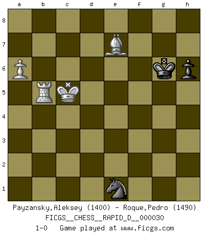 Last move : 1-0 2010 February 4 22:33:31 [Event "FICGS__CHESS__RAPID_D__000030"] [Site "FICGS"] [Date "2009.11.24"] [Round "1"] [White "Payzansky,Aleksey"] [Black "Roque,Pedro"] [Result "1-0"] [WhiteElo "1400"] [BlackElo "1490"] 1.e4 c5 2.Nf3 e6 3.d4 cxd4 4.Nxd4 Nc6 5.Nc3 Qc7 6.Be3 a6 7.Qd2 Nf6 8.O-O-O Bb4 9.f3 Ne5 10.g4 h6 11.h4 Bxc3 12.bxc3 d5 13.Bf4 dxe4 14.Nb3 Nfd7 15.fxe4 b5 16.Be2 Bb7 17.Qe3 f6 18.Rd4 Bc6 19.Rhd1 g5 20.Bh2 Rc8 21.Rd6 Kf7 22.Nc5 Nxc5 23.Bxe5 Nxe4 24.Rxc6 Qxc6 25.Qa7+ Rc7 26.Bxc7 Ra8 27.Qe3 Rc8 28.Ba5 Nxc3 29.Qa7+ Kf8 30.Qh7 Nxe2+ 31.Kb2 Qxc2+ 32.Qxc2 Rxc2+ 33.Kxc2 gxh4 34.Bd8 Kf7 35.Rf1 Nd4+ 36.Kd3 Nc6 37.Bxf6 Kg6 38.Bxh4 Ne5+ 39.Ke4 Nxg4 40.Rf8 a5 41.Rb8 b4 42.Rb5 a4 43.Rxb4 Kh5 44.Be7 Kg6 45.Rxa4 Kf7 46.Bh4 Kg6 47.Rb4 Kh5 48.Be7 Nf2+ 49.Kf3 Nd3 50.Rb5+ Kg6 51.a4 e5 52.Ke4 Nf4 53.Kxe5 Nd3+ 54.Kd6 Ne1 55.a5 Nc2 56.Kc5 Ne1 57.a6 1-0 Sicilian : Taimanov variation Queenside Castling by player White (move 8) 10 pieces endgame at move 39 : White KRBP , Black KNPPPP WHITE : King + 1 Rook 1 Bishop 1 Pawn BLACK : King + 1 Knight 4 Pawns 9 pieces endgame at move 43 : White KRBP , Black KNPPP WHITE : King + 1 Rook 1 Bishop 1 Pawn BLACK : King + 1 Knight 3 Pawns 8 pieces endgame at move 45 : White KRBP , Black KNPP WHITE : King + 1 Rook 1 Bishop 1 Pawn BLACK : King + 1 Knight 2 Pawns 7 pieces endgame at move 53 : White KRBP , Black KNP WHITE : King + 1 Rook 1 Bishop 1 Pawn BLACK : King + 1 Knight 1 Pawn Player White won this chess game. Follow this game move after move (download)Many have become Chess Masters, no one has become the Master of Chess. (Siegbert Tarrasch) Ohne Leiden bildet sich kein Charakter. (Ernst Freiherr von Feuchtersleben) Todavía soy una víctima del Ajedrez. Tiene toda la belleza del arte y mucho mas. No puede ser comercializado. El Ajedrez es mas puro que el arte en su posición social. (Marcel Duchamp) Des points faibles ou des trous dans la position de l'adversaire doivent être occupés par des pièces et non pas par des pions. (Siegbert Tarrasch) Vladimir Ras-Putin is still alive... He is also a good actor, I saw him in the Lord of the Rings. (Rodolfo d'Ettorre)