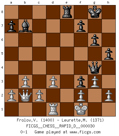Last move : 0-1 2009 December 22 17:18:28 [Event "FICGS__CHESS__RAPID_D__000030"] [Site "FICGS"] [Date "2009.11.24"] [Round "1"] [White "Frolov,Valery"] [Black "Leurette,Marc-Antoine"] [Result "0-1"] [WhiteElo "1400"] [BlackElo "1371"] 1.e4 e5 2.Nc3 Nf6 3.Nf3 Nc6 4.Bc4 Nxe4 5.Ng5 Nxg5 6.O-O Bc5 7.Qe1 O-O 8.Na4 d6 9.Nxc5 dxc5 10.Bb5 Qf6 11.Bxc6 bxc6 12.d3 Ba6 13.Qa5 Bc8 14.Qxc5 Ne6 15.Qxc6 Rb8 16.Qc4 Bb7 17.Be3 Nf4 18.Bxf4 exf4 19.Qxc7 Rfc8 20.Qa5 f3 21.g3 Ba6 22.Rfc1 Qb6 23.Qa3 Re8 24.Re1 Rxe1+ 25.Rxe1 Bb7 26.b3 g6 27.Qb2 h5 28.Qe5 Rf8 29.Qb2 Qb4 30.Rd1 Re8 31.Kf1 Qg4 0-1 Vienna : Falkbeer variation Kingside Castling by player White (move 6) Kingside Castling by player Black (move 7) Player Black won this chess game. Follow this game move after move (download)Chess is as much a mystery as women. (Purdy) Über Karpov: Er war und ist ein Vertreter der russischen Reaktionäre. Das steckt tief in seiner Seele, wehalb ich nicht nett mit ihm umgehen kann. (Viktor Kortschnoi) Hoy en día, si tu no eres un Gran Maestro a los 14 años, es mejor que lo olvides. (Anand Viswanathan) Le pion, dans sa simplicité, marche droit devant lui, mais lorsqu'il prend, il le fait obliquement? Ainsi l'homme, tant qu'il reste pauvre, marche dans la droiture et vit honnêtement, mais lorsqu'il recherche les honneurs, il flatte, se parjure et, par les voies obliques, cherche une position supérieure sur l'échiquier du monde. (Jean de Galles) Art disturbs, science reassures. (Georges Braque, Le Jour et la Nuit)