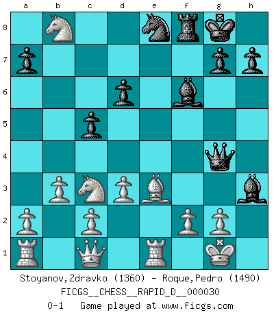 Last move : 0-1 2009 December 1 20:26:1 [Event "FICGS__CHESS__RAPID_D__000030"] [Site "FICGS"] [Date "2009.11.24"] [Round "1"] [White "Stoyanov,Zdravko"] [Black "Roque,Pedro"] [Result "0-1"] [WhiteElo "1360"] [BlackElo "1490"] 1.e4 c5 2.Nf3 Nc6 3.Bb5 d6 4.Bxc6+ bxc6 5.h3 e5 6.d3 Be7 7.O-O Rb8 8.Nc3 Nf6 9.Re1 O-O 10.b3 Ne8 11.Be3 f5 12.exf5 Bxf5 13.Qc1 Bxh3 14.Nxe5 Bf6 15.Nxc6 Qc8 16.Nxb8 Qg4 0-1 Sicilian : Nimzovich-Rossolimo attack (without ...d6) Kingside Castling by player White (move 7) Kingside Castling by player Black (move 9) Player Black won this chess game. Follow this game move after move (download)Becoming successful at Chess allows you to discover your own personality. That's what I want for the kids I teach. (Saudin Robovic) Matt entspricht nicht immer den Tatsachen. (Savielly Grigorievitsch Tartakower) Cada Peón es potencialmente una Reina. (James Mason) Botvinnik disait en comparant les échecs à la musique: Il existe une science dont le but est l'étude de l'acoustique et des sons. Mais il y a aussi un art qui se sert de l'océan des sons : c'est la musique. De toute évidence, il en est de même pour la pensée. La logique est l'étude des lois de la réflexion et les échecs reflètent, en tant qu'art, le côté logique de la réflexion, sous la forme d'images artistiques... Extrait de Fischer - Spassky, Reykjavik 1972 par Alexander & F. Wyndham (Ed. Solar), p 37. Programmer - an organism that turns coffee into software. (Anonymous)