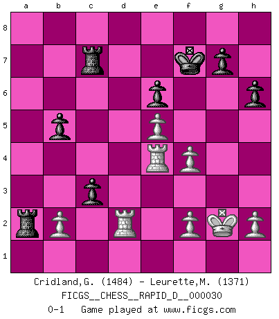 Last move : 0-1 2009 December 16 22:42:3 [Event "FICGS__CHESS__RAPID_D__000030"] [Site "FICGS"] [Date "2009.11.24"] [Round "1"] [White "Cridland,Graham"] [Black "Leurette,Marc-Antoine"] [Result "0-1"] [WhiteElo "1484"] [BlackElo "1371"] 1.e4 e5 2.Nf3 Nc6 3.Bb5 Nf6 4.O-O Nxe4 5.d4 Nd6 6.Bxc6 dxc6 7.dxe5 Nf5 8.Qxd8+ Kxd8 9.Nc3 Bc5 10.Ne4 Bb6 11.Neg5 Be6 12.Nxe6+ fxe6 13.Bg5+ Ne7 14.Rac1 h6 15.Bd2 Nf5 16.c4 Nd4 17.Rfe1 Ke7 18.c5 Nxf3+ 19.gxf3 Rhd8 20.Bb4 a5 21.cxb6 axb4 22.bxc7 Rdc8 23.Rc4 Rxc7 24.Rxb4 Rxa2 25.Re3 Ra5 26.f4 b5 27.Rg3 Kf7 28.Rd3 c5 29.Re4 c4 30.Rd2 Ra2 31.Kg2 c3 0-1 Ruy Lopez : Berlin defense, Open variation Kingside Castling by player White (move 4) Player Black won this chess game. Follow this game move after move (download)Chess is a more highly symbolic game, but the aggressions are therefore even more frankly represented in the play. It probably began as a war game; that is, the representation of a miniature battle between the forces of two kingdoms. (Karl Meninger) Mein erstes Ziel war nicht, die Partie zu gewinnen, sondern eine Figur zu opfern. -- der junge (Wilhelm Steinitz) El ganar no lo es todo... pero el perder es nada. (Mednis) Les échecs sont plus proches de l'art de l'assassinat que de l'art de la guerre. (Arturo Perez-Reverte) Now the reason the enlightened prince and the wise general conquer the enemy whenever they move and their achievements surpass those of ordinary men is foreknowledge. (Sun Tzu)