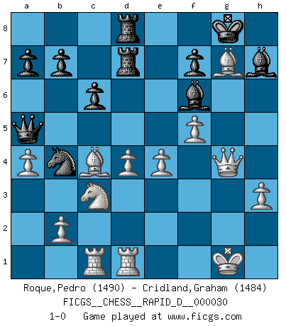Last move : 1-0 2010 January 29 21:7:19 [Event "FICGS__CHESS__RAPID_D__000030"] [Site "FICGS"] [Date "2009.11.24"] [Round "1"] [White "Roque,Pedro"] [Black "Cridland,Graham"] [Result "1-0"] [WhiteElo "1490"] [BlackElo "1484"] 1.d4 d5 2.c4 c6 3.Nf3 Nf6 4.Nc3 dxc4 5.a4 Na6 6.e4 Bg4 7.Bxc4 e6 8.Be3 Nb4 9.O-O Be7 10.Rc1 O-O 11.h3 Bh5 12.Qe2 Qa5 13.Rfd1 Rad8 14.g4 Bg6 15.Ne5 Nd7 16.Nxd7 Rxd7 17.f4 h6 18.f5 exf5 19.gxf5 Bh7 20.Qg4 Rfd8 21.Bxh6 Bf6 22.Bxg7 1-0 QGD Slav : Smyslov variation Kingside Castling by player White (move 9) Kingside Castling by player Black (move 10) Player White won this chess game. Follow this game move after move (download)Spassky will not be psyched out by Fischer. (Mike Goodall) Darum geht es im Schach. Einen Tag gibst du deinem Gegner eine Lektion, am nächsten Tag gibt er dir eine. (Robert James Fischer) Un Peón pasado es un criminal, quién debe ser mantenido bajo candado y llave. Leves medidas, tales como vigilancia policiaca, no son suficientes. (Aaron Nimzovich) A chaque perte on perd un peu de soi. (Joël Lautier) Don't anthropomorphize computers - they hate it. (Anonymous)