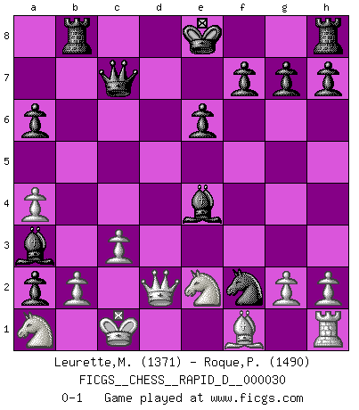 Last move : 0-1 2010 January 29 9:26:46 [Event "FICGS__CHESS__RAPID_D__000030"] [Site "FICGS"] [Date "2009.11.24"] [Round "1"] [White "Leurette,Marc-Antoine"] [Black "Roque,Pedro"] [Result "0-1"] [WhiteElo "1371"] [BlackElo "1490"] 1.e4 c5 2.Nc3 d6 3.Nf3 a6 4.d4 cxd4 5.Nxd4 Nf6 6.Be3 e6 7.f3 b5 8.Qd3 Qc7 9.f4 Be7 10.a4 b4 11.Nce2 Nbd7 12.c3 Nc5 13.Qc2 Bb7 14.e5 dxe5 15.fxe5 Ng4 16.Bf4 Be4 17.Qd2 Nd3+ 18.Kd1 Ngf2+ 19.Kc2 b3+ 20.Kb1 Nxf4 21.Kc1 N4d3+ 22.Kb1 Nxe5 23.Kc1 Ned3+ 24.Kb1 Nb4 25.Kc1 Na2+ 26.Rxa2 bxa2 27.Nb3 Rb8 28.Na1 Ba3 0-1 Sicilian : Closed Player Black won this chess game. Follow this game move after move (download)The sign of a great Master is his ability to win a won game quickly and painlessly. (Irving Chernev) Modernes Schach erfordert enorme Anspannung. Es ist für einen normalen Menschen unmöglich das auszuhalten. (Viktor Kortschnoi) El Ajedrez es la vida. (Bobby Fischer) En blitz, le Cavalier l'emporte sur le Fou. (Vlastimil Hort) Do not put your faith in what statistics say until you have carefully considered what they do not say. (William W. Watt)
