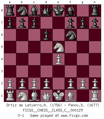 Last move : 0-1 2010 January 5 8:26:43 [Event "FICGS__CHESS__CLASS_C__000129"] [Site "FICGS"] [Date "2009.11.25"] [Round "1"] [White "Ortiz de Latierro,Aitor"] [Black "Panov,Dmitriy"] [Result "0-1"] [WhiteElo "1756"] [BlackElo "1677"] 1.e4 e5 2.Nf3 Nf6 3.Nxe5 d6 0-1 This chess game has been lost on time (started : 2009.11.25 16:20:19) Petrov's defense Player Black won this chess game. Follow this game move after move (download)I give 98 percent of my mental energy to Chess. Others give only 2 percent. (Bobby Fischer) Dein Körper muss in Topform sein. Dein Schach verfällt, wenn dein Körper verfällt. Der Körper kann nicht vom Geist getrennt werden. (Robert James Fischer) La belleza de un movimiento no se refleja solo en su apariencia, sino en el pensamiento detrás de él. (Siegbert Tarrasch) Soyez une menace à chaque fois que vous vous asseyez pour jouer. (Ken Smith) As the days dwindle down... to a precious few. (Maxwell Anderson)