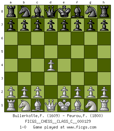 Last move : 1-0 2010 January 7 20:30:9 [Event "FICGS__CHESS__CLASS_C__000129"] [Site "FICGS"] [Date "2009.11.25"] [Round "1"] [White "Bullerkotte,Frank"] [Black "Peurou,Fabrice"] [Result "1-0"] [WhiteElo "1609"] [BlackElo "1800"] 1.d4 1-0 This chess game has been lost on time (started : 2009.11.25 16:20:19) Queen's pawn Player White won this chess game. Follow this game move after move (download)When the Chess game is over, the Pawn and the King go back to the same box. (Irish saying) Ivan Sokolov treibt mich als Beifahrer an mit go Loeky go - . (Loek van Wely) El muchacho (en ese entonces un niño de 12 años llamado Anatoly Karpov) no tiene ni idea de lo que es el Ajedrez y no hay futuro en absoluto para el en esta profesión. (Mikhail Botvinnik) Soyez une menace à chaque fois que vous vous asseyez pour jouer. (Ken Smith) Memory is a crazy woman that hoards colored rags and throws away food. (Austin O'Malley)