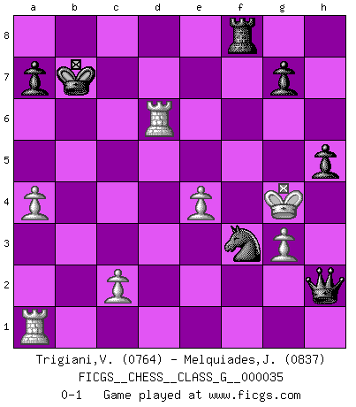 Last move : 0-1 2010 April 7 19:21:26 [Event "FICGS__CHESS__CLASS_G__000035"] [Site "FICGS"] [Date "2009.11.25"] [Round "1"] [White "Trigiani,Vincenzo"] [Black "Melquiades,Jay"] [Result "0-1"] [WhiteElo "0764"] [BlackElo "0837"] 1.d4 d5 2.Bf4 c6 3.Nc3 e5 4.e3 Bb4 5.Bxe5 Bxc3+ 6.bxc3 f6 7.Bd3 fxe5 8.dxe5 Ne7 9.c4 Bf5 10.Bxf5 Nxf5 11.Nf3 Qa5+ 12.Kf1 Nd7 13.g3 O-O-O 14.cxd5 Rhf8 15.dxc6 bxc6 16.Kg2 Nxe5 17.Re1 Rxd1 18.Rexd1 Nxf3 19.Kxf3 Nd4+ 20.Kg2 Nf3 21.e4 Qb6 22.Rd6 Nh4+ 23.Kh3 Nf3 24.a4 Qxf2 25.Rxc6+ Kb7 26.Rd6 Qxh2+ 27.Kg4 h5+ 0-1 Queen's pawn, Mason variation Queenside Castling by player Black (move 13) Player Black won this chess game. Follow this game move after move (download)Chess is a beautiful mistress. (Bent Larsen) Ein bischen Romantik kann weder im Schach noch in der Liebe schaden. Also versuche ich mich ab und zu daran zu erinnern. (Nigel Short) Aquellos que dicen que entienden al Ajedrez, no entienden nada. (Robert Hubner) Si je n'étais pas joueur d'échecs, je serais le meilleur dans quelque chose d'autre. (Anatoli Karpov) Creativity is allowing yourself to make mistakes. Art is knowing which ones to keep. (Scott Adams)
