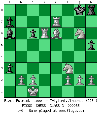 Last move : 1-0 2010 April 18 16:7:7 [Event "FICGS__CHESS__CLASS_G__000035"] [Site "FICGS"] [Date "2009.11.25"] [Round "1"] [White "Bizet,Patrick"] [Black "Trigiani,Vincenzo"] [Result "1-0"] [WhiteElo "1000"] [BlackElo "0764"] 1.e3 e5 2.Nc3 Bc5 3.d4 exd4 4.exd4 Bd6 5.Qg4 Nc6 6.Qxg7 Qf6 7.Qg4 Nh6 8.Ne4 Nxg4 9.Nxf6+ Ke7 10.Nxg4 Nxd4 11.Bg5+ f6 12.Bxf6+ Kf7 13.Bxd4 h5 14.Ne5+ Ke7 15.Ng6+ Ke8 16.Bxh8 c6 17.Nf3 b5 18.O-O-O Ba6 19.a4 Kf7 20.Bd3 bxa4 21.Bf5 a3 22.Rhe1 Kg8 23.Bxd7 Kh7 24.Rxd6 Rxh8 25.Re7+ Kg8 26.Be6+ 1-0 Van't Kruijs Opening Queenside Castling by player White (move 18) Player White won this chess game. Follow this game move after move (download)Many Chess players were surprised when after the game, Fischer quietly explained: 'I had already analyzed this possibility' in a position which I thought was not possible to foresee from the opening. (Mikhail Tal) Die größte Kunst beim Schach besteht darin dem Gegner nicht zu zeigen was er tun kann. (Garry Kasparov) El tablero es el mundo, las piezas es el fenomeno del universo, las reglas del juego son lo que llamamos leyes de la naturaleza y el jugador del lado opuesto, se encuentra oculto a nuestra vista. (Thomas Huxley) Les pièces de l'échiquier étaient impitoyables. Elles le retenaient, elles l'absorbaient. Il y avait de l'horreur en cela, mais aussi une harmonie unique. Car, qu'y a-t-il dans le monde, à part les échecs ? (V. Nabokov) Kids, you tried your best and you failed miserably. The lesson is, never try. (Simpsons)