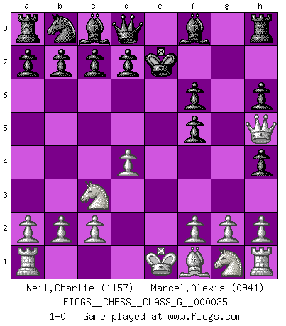 Last move : 1-0 2010 February 2 20:44:58 [Event "FICGS__CHESS__CLASS_G__000035"] [Site "FICGS"] [Date "2009.11.25"] [Round "1"] [White "Neil,Charlie"] [Black "Marcel,Alexis"] [Result "1-0"] [WhiteElo "1157"] [BlackElo "0941"] 1.d4 f5 2.Bg5 h6 3.Bh4 g5 4.e4 Nf6 5.e5 gxh4 6.exf6 exf6 7.Qh5+ Ke7 8.Nc3 1-0 Dutch, 2.Bg5 variation Player White won this chess game. Follow this game move after move (download)Every Chess master was once a beginner. (Chernev) Mein erstes Ziel war nicht, die Partie zu gewinnen, sondern eine Figur zu opfern. -- der junge (Wilhelm Steinitz) Fischer era un maestro de claridad y un Rey del posicionamiento astuto. Sus oponentes podían ver hacia donde se dirigía pero eran impotentes para detenerlo. (Bruce Pandolfini) Le thème de l'attaque double intervient d'une manière ou d'une autre dans l'immense majorité des combinaisons. (Youri Averbakh) The hypothalamus is one of the most important parts of the brain, involved in many kinds of motivation, among other functions. The hypothalamus controls the 'Four Fs: Fighting, Fleeing, Feeding and Mating. (Unknown author)